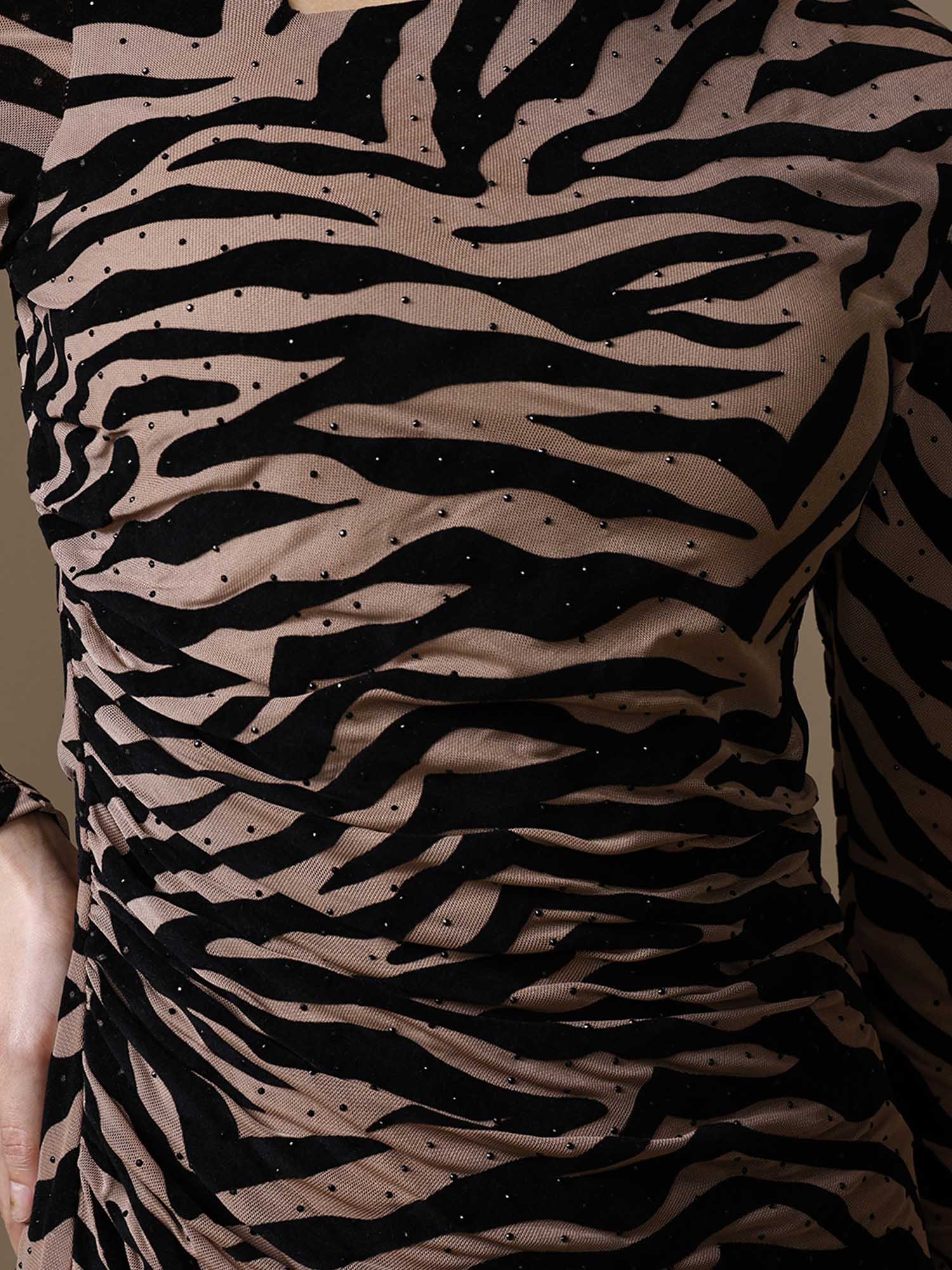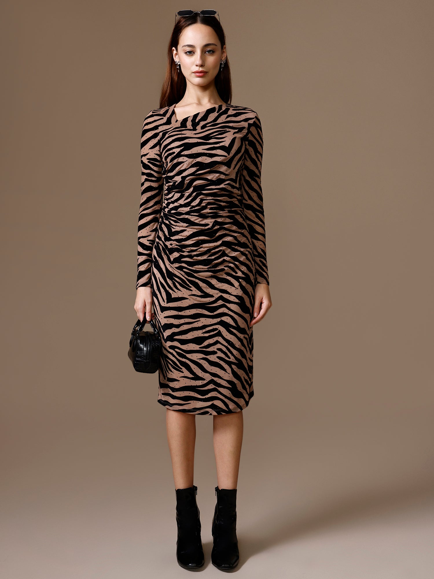 Unleash your bold side with this Zebra Print Bodycon Midi Dress. Featuring a striking animal print, long sleeves, and a flattering ruched waist detail, it’s designed to make a statement. The fitted silhouette enhances curves while the midi length keeps it elegant perfect for night outs, parties, or confident day wear.