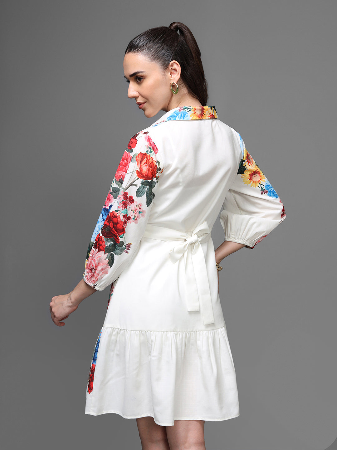 The LAPIN Mini Dress is a vibrant, statement-making floral piece crafted to bring elegance and freshness to any wardrobe. Designed with a crisp white base covered in multicolour florals, this dress blends femininity with effortless sophistication. The button-down front, soft collar, and tiered hem add structure, while the detachable waist tie enhances shape and definition. A perfect choice for brunches, resort getaways, and daytime events.
