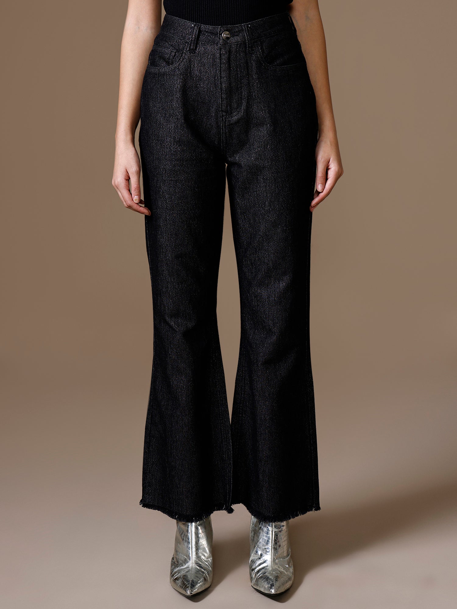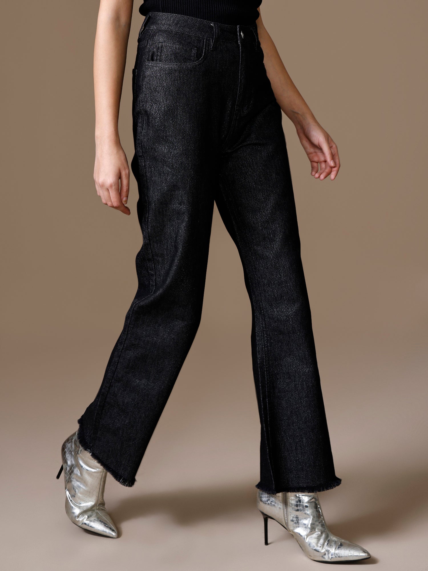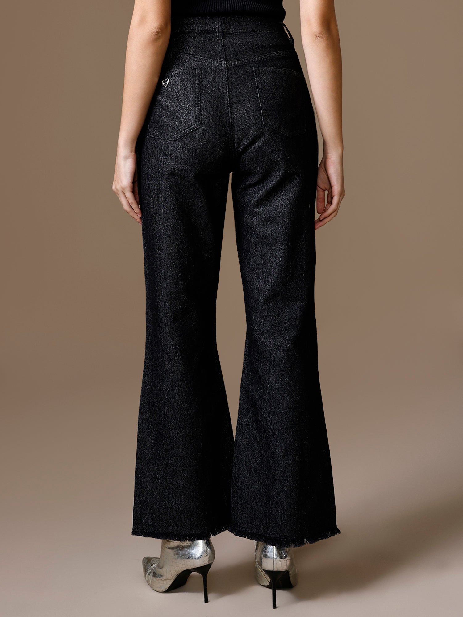 The Shimmer Flared Jeans in black are crafted from shimmer denim with a high-rise waist and flared silhouette bringing a bold, statement edge to your denim collection.