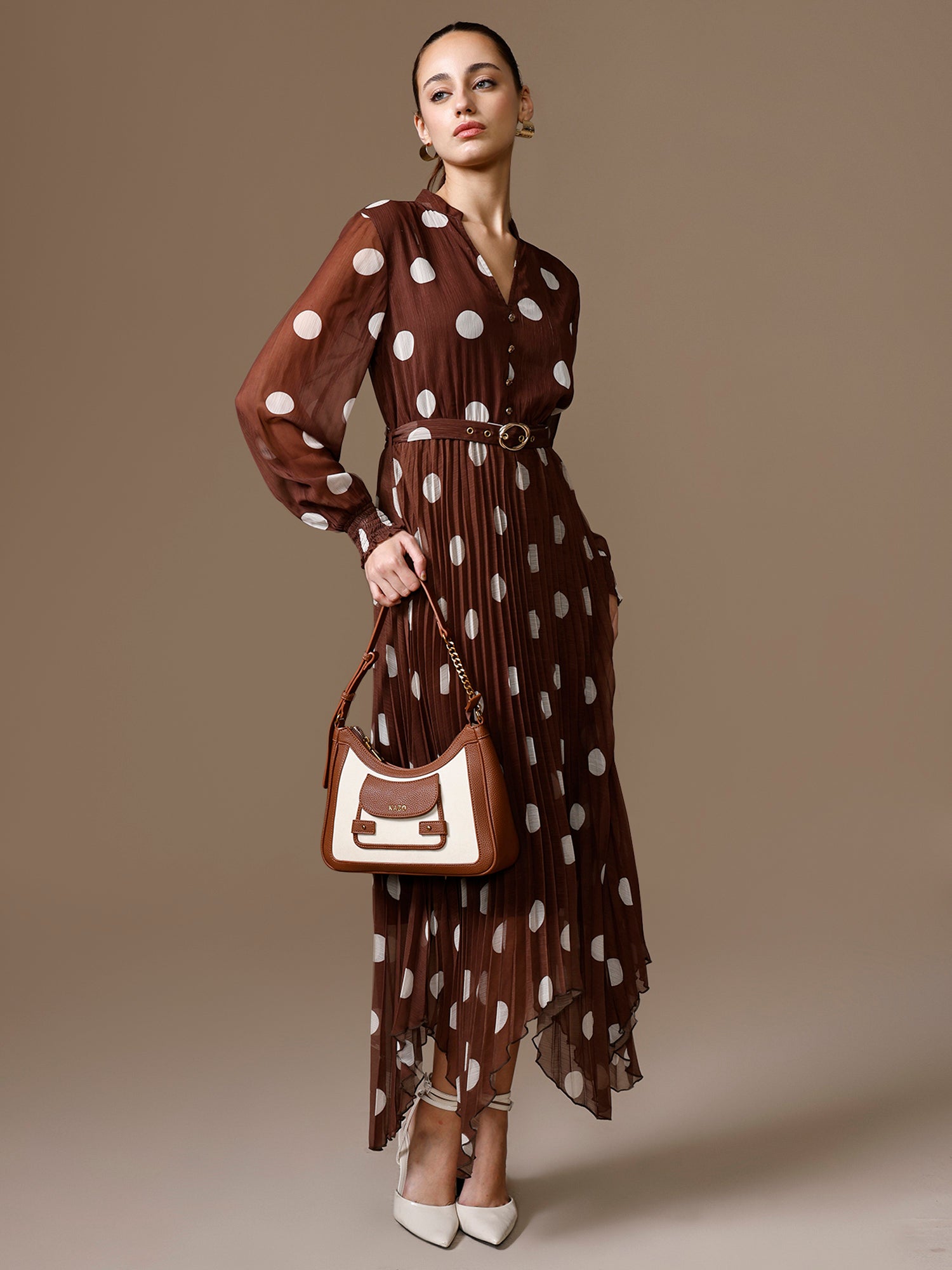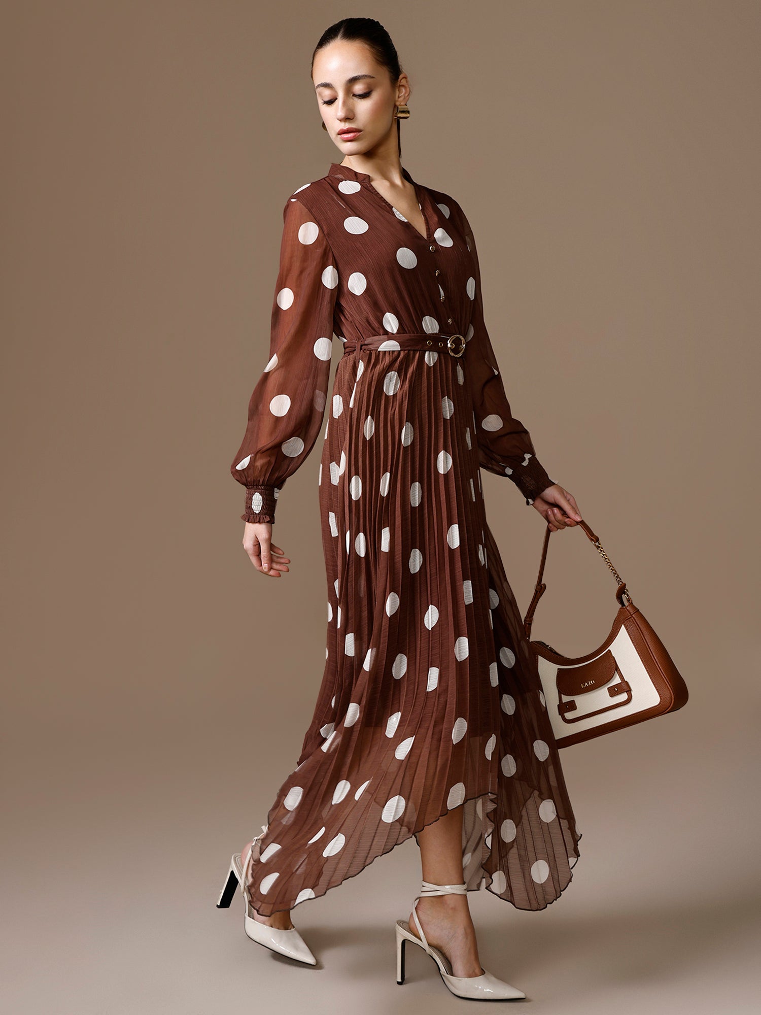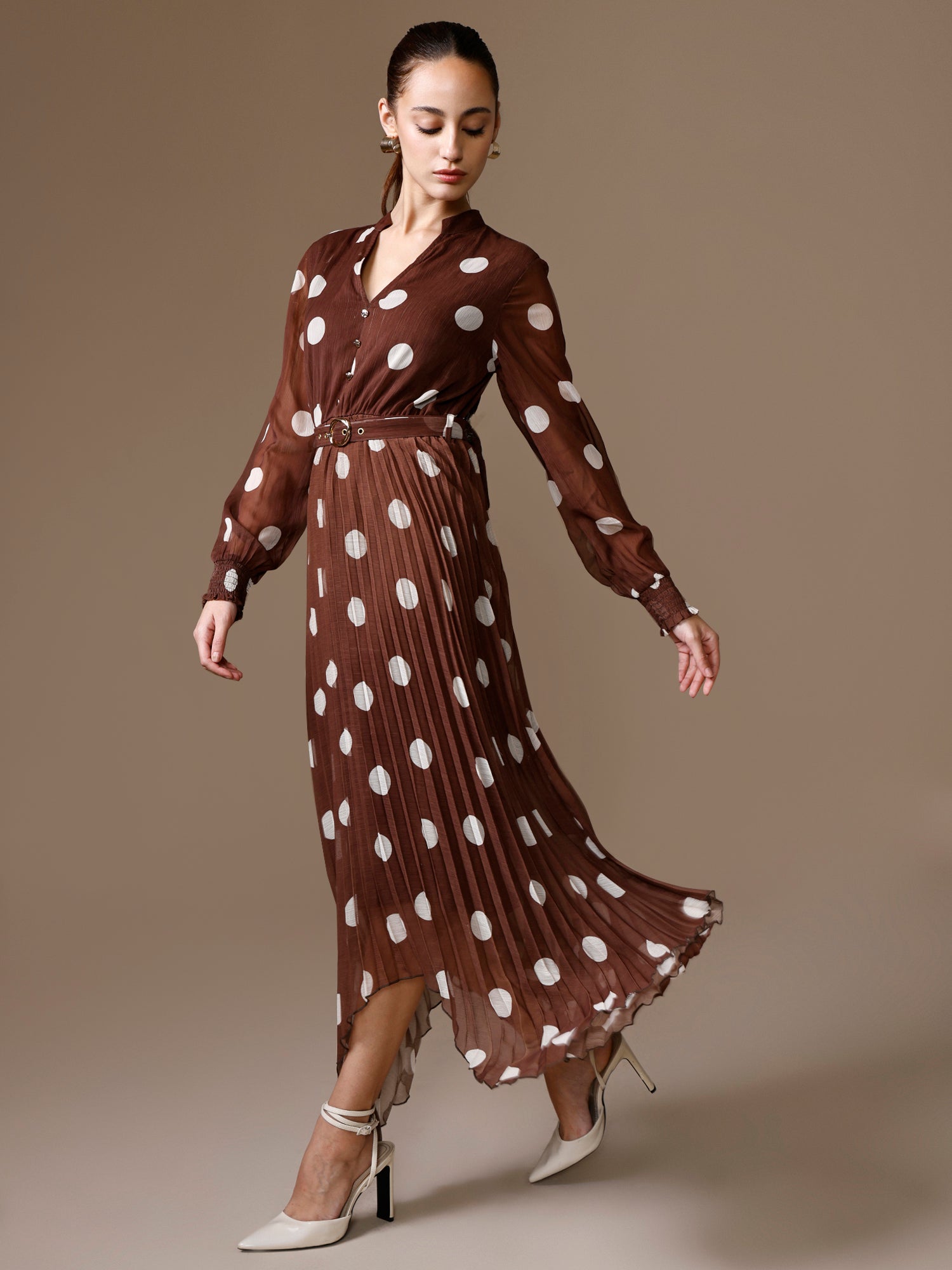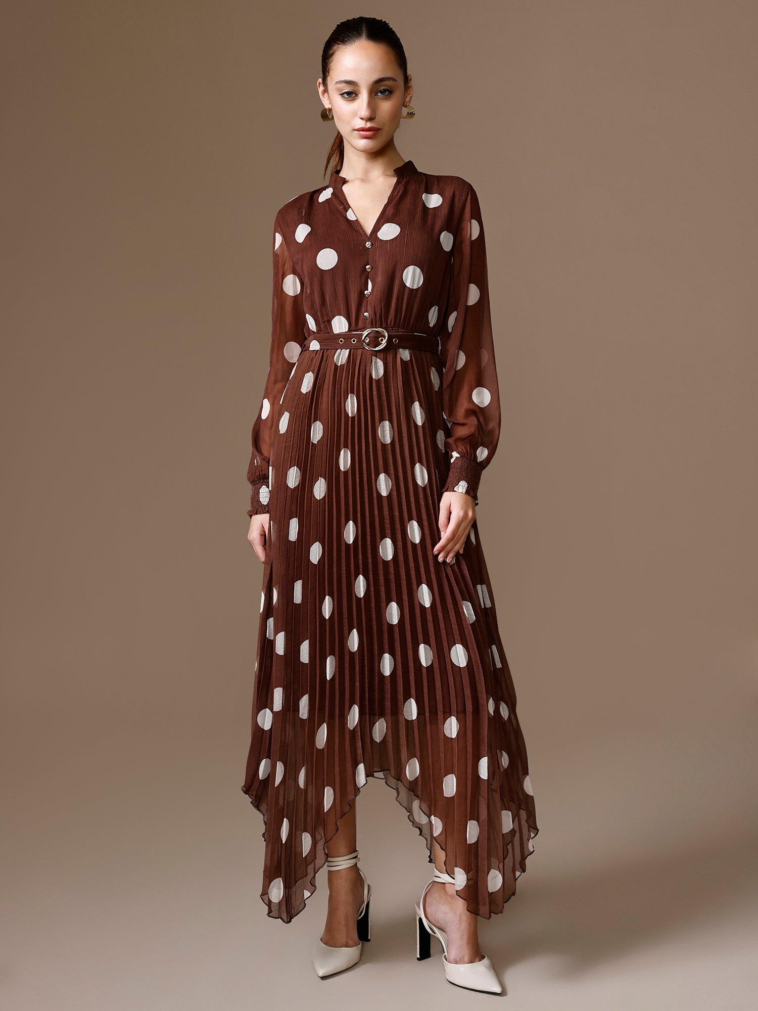 Playful yet elegant, the Dot Midi Dress is a timeless classic reimagined. Designed with a flowy silhouette, it features bold polka dots, a belted waist for definition, and sheer long sleeves for a touch of sophistication. The high-low hemline adds movement, making it perfect for brunches, evenings out, or festive gatherings.