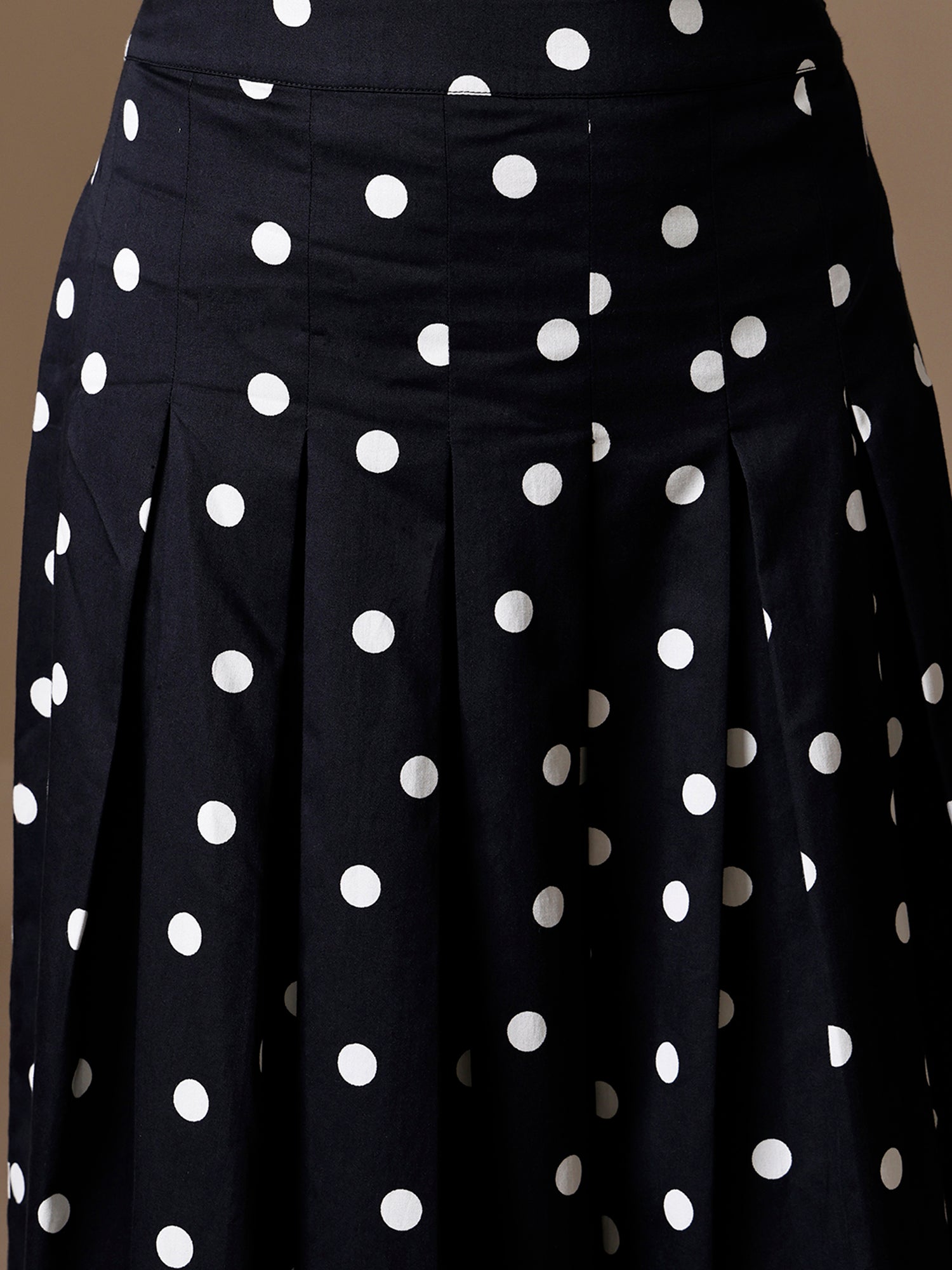 This black polka dot midi skirt is a timeless and versatile piece that blends retro charm with contemporary elegance. The all-over white polka dots create a playful yet sophisticated contrast, while the A-line silhouette flatters the waist and gives a graceful flow with every step. The skirt’s midi length makes it perfect for both day and evening wear professional when paired with shirts, chic with crop tops, and elegant with blouses. Its pleated fall and structured waistband add definition, making it suitable for styling across seasons. Ideal for work, brunches, or evening outings, it can be worn with heels for a polished look or sneakers for casual chic.