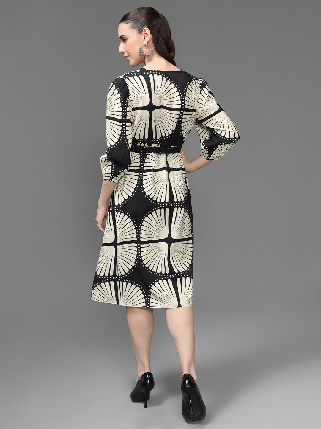 Bold yet elegant, the Kramer Midi Dress with Belt stands out with its contemporary geometric print and refined silhouette. Designed in a chic black-and-white pattern, it features a flattering V-neckline and three-quarter sleeves that add a touch of sophistication. Crafted from soft, breathable fabric, this midi dress ensures both comfort and poise. The waist belt cinches the figure, enhancing the feminine shape, while the flowing skirt moves gracefully with every step. Perfect for day events, brunches, or evening gatherings, the Kramer Midi Dress is a versatile statement piece that exudes effortless charm.