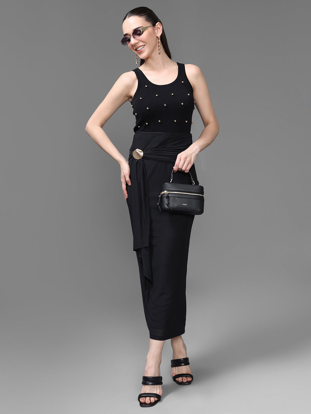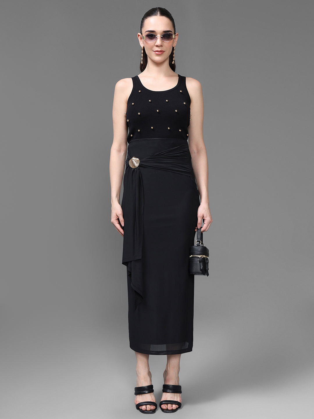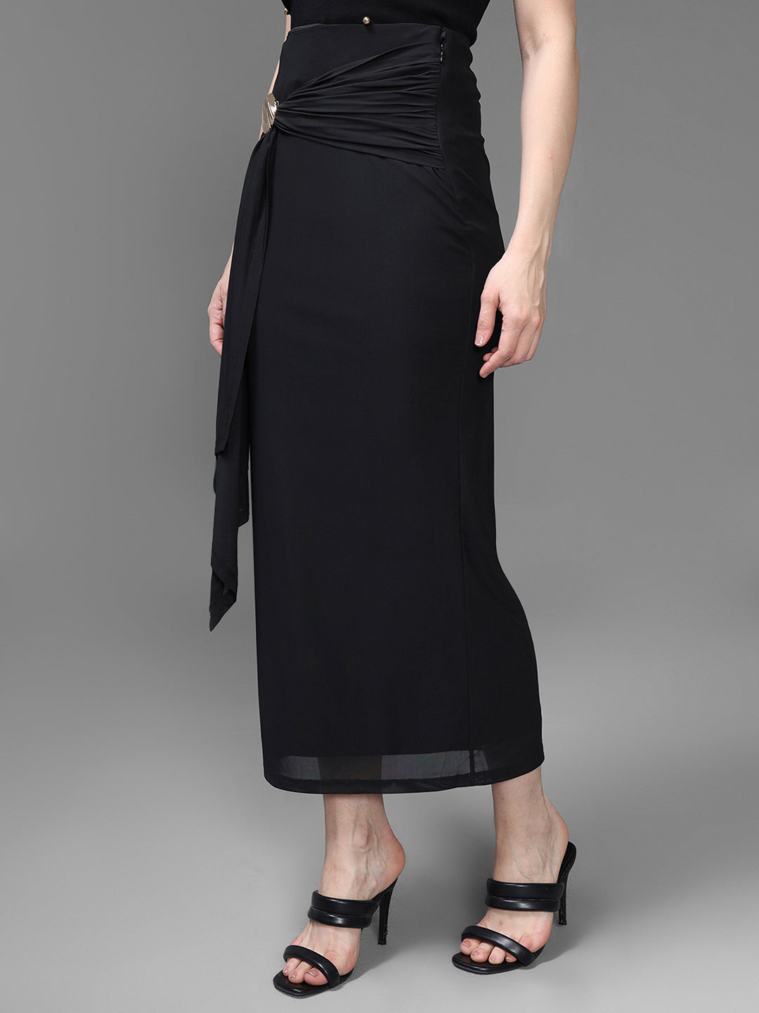 The Misha Skirt embodies timeless elegance with a touch of modern glamour, this statement piece features a sleek wrap-style silhouette that drapes beautifully along the body. A side knot detail adorned with a gold accent buckle adds an elevated finish, making it perfect for both formal and festive occasions. The soft, flowy fabric ensures comfort and movement, while the ankle-length cut exudes refined sophistication. Pair the Misha Skirt with a fitted blouse or cami for a chic, polished ensemble that transitions seamlessly from day to night.