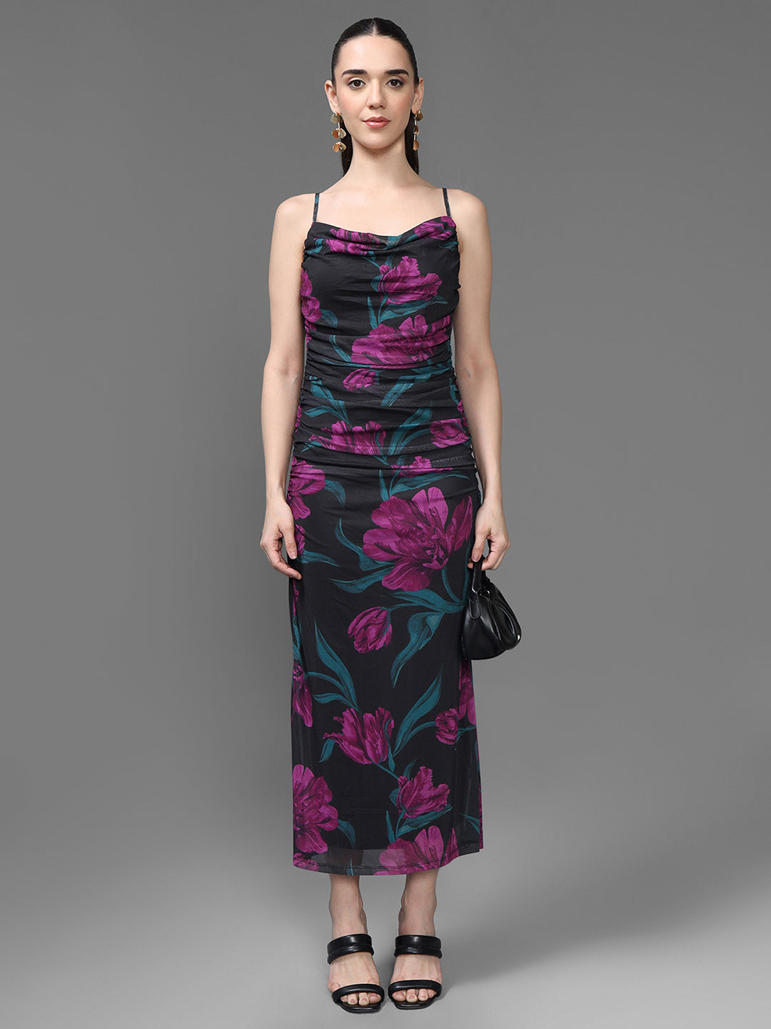 Turn heads with the Hepburn Maxi Dress, a blend of elegance and modern charm. Crafted from soft, stretchable fabric, it features a flattering bodycon fit, cowl neckline, and delicate spaghetti straps for a sleek, feminine look. The floral print on a deep base adds vibrant sophistication, while the ankle-length silhouette ensures timeless grace. Perfect for evening outings, date nights, or vacation dinners style it with heels and minimal jewelry for effortless allure.