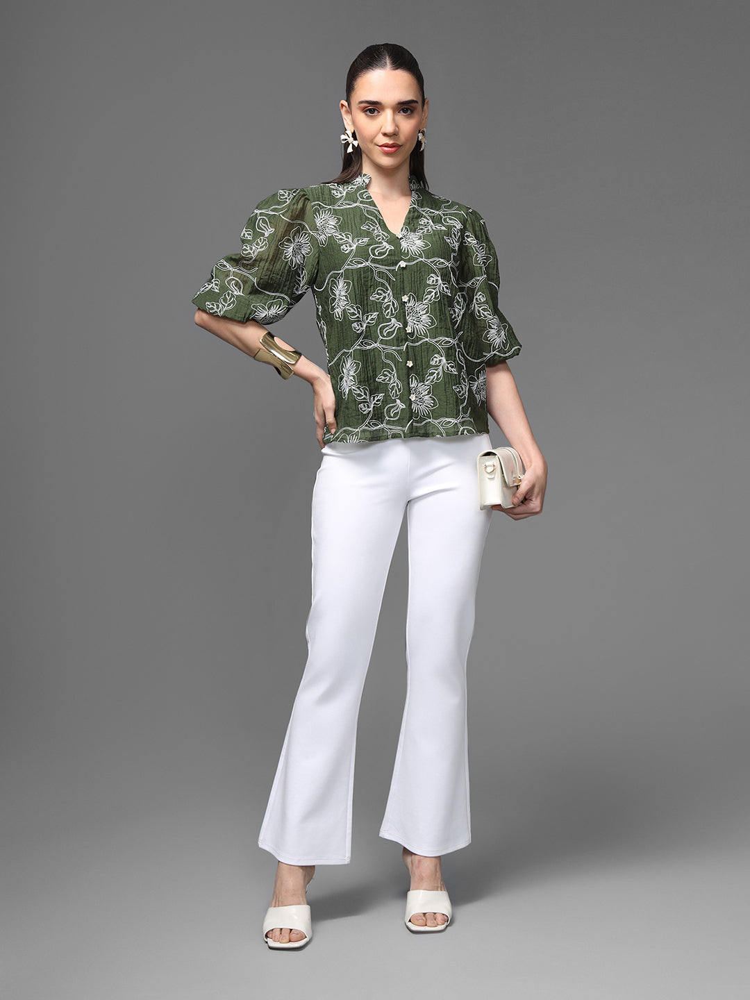 A Chic Floral Embroidered Blouse Crafted In An Olive Green Textured Fabric. Featuring A Soft V-Slit Neckline, Delicate Front Button Closure, And Voluminous 3/4 Puff Sleeves, This Top Blends Femininity With Everyday Ease. The White Floral Embroidery Adds A Refined Contrast, Making It Perfect For Both Casual And Semi-Formal Looks.