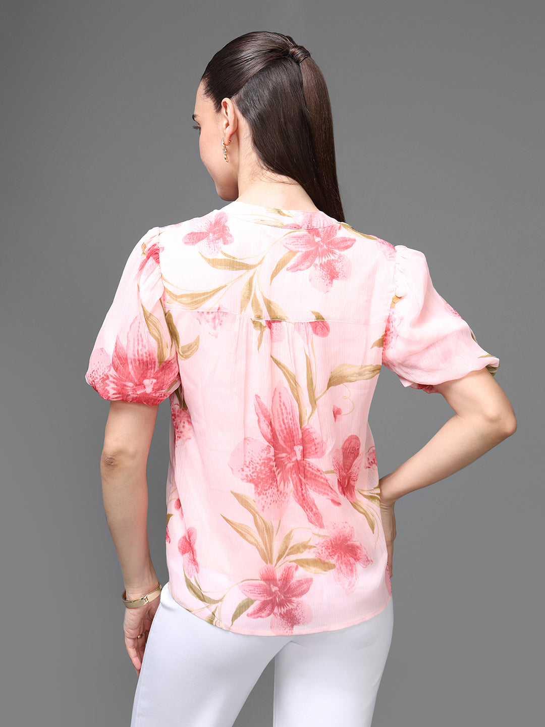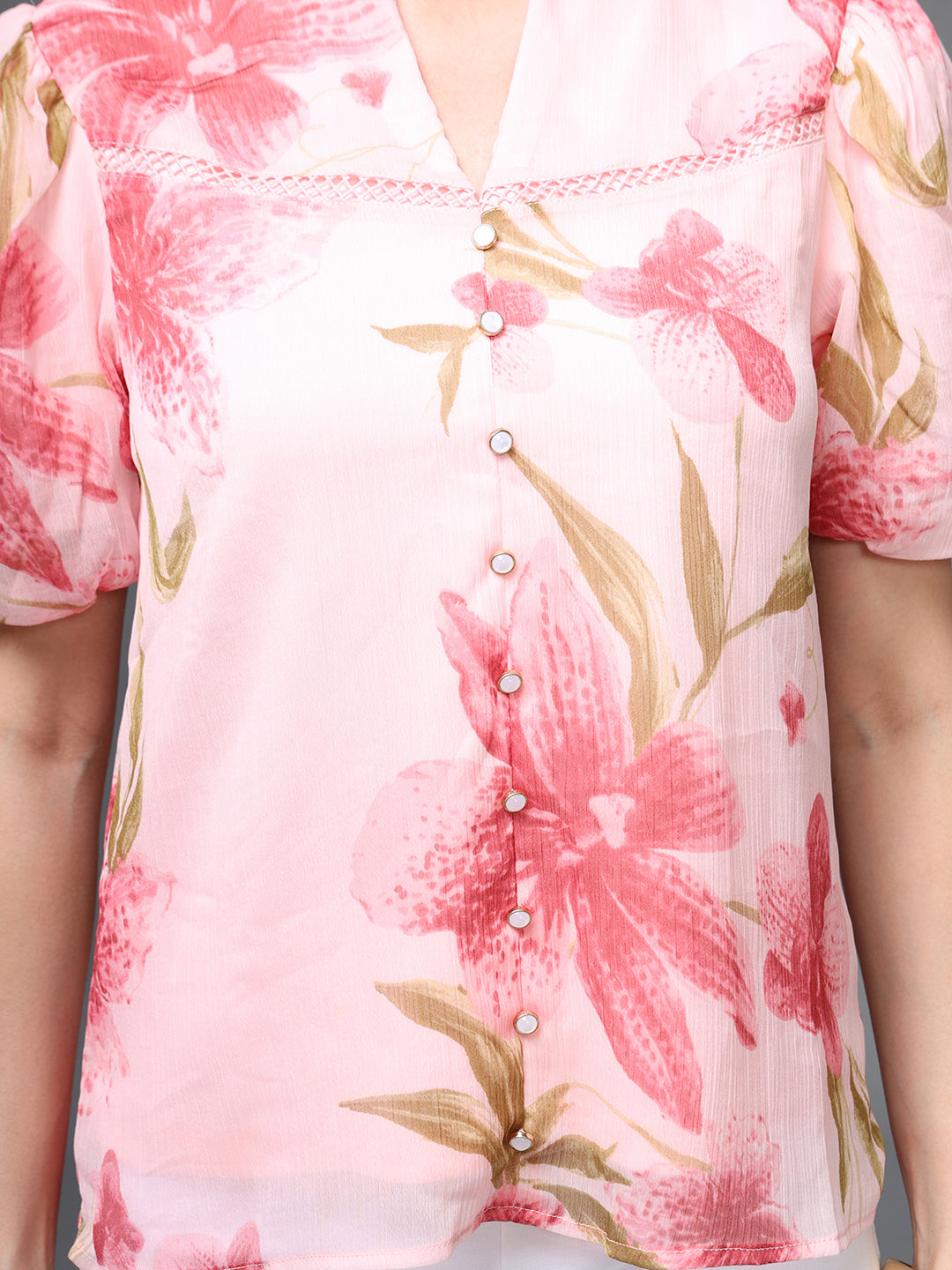 A soft, feminine blouse featuring a delicate floral print in soothing pastel tones. Its relaxed silhouette, airy sleeves, and flattering neckline make it a perfect choice for both everyday elegance and casual outings.