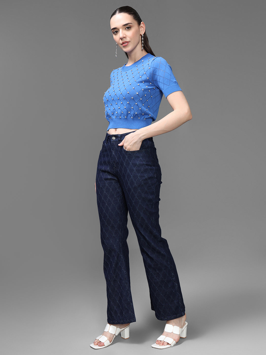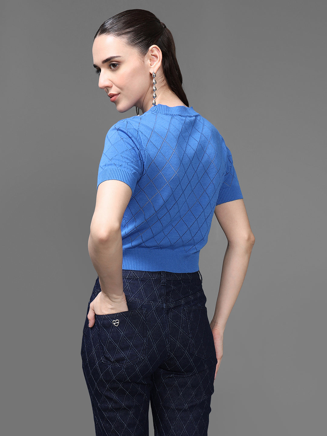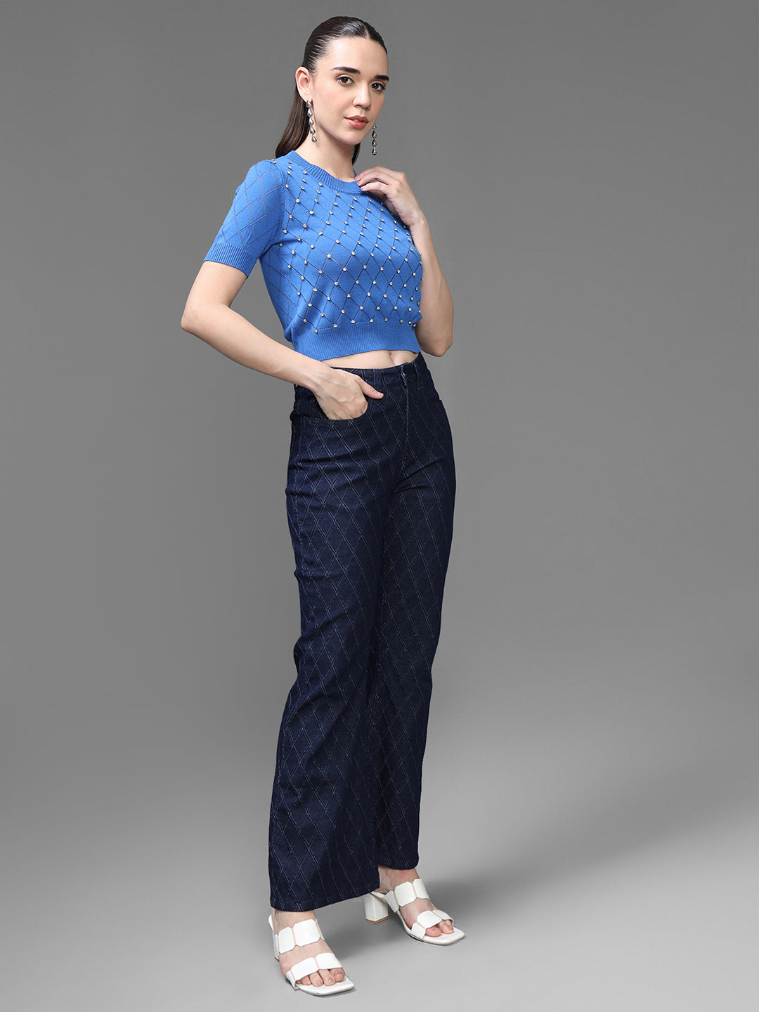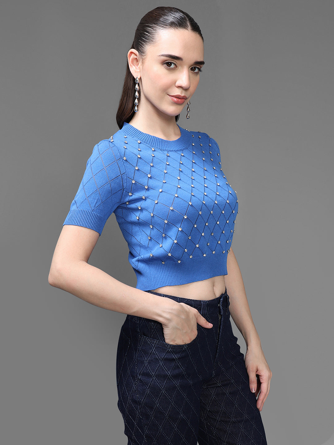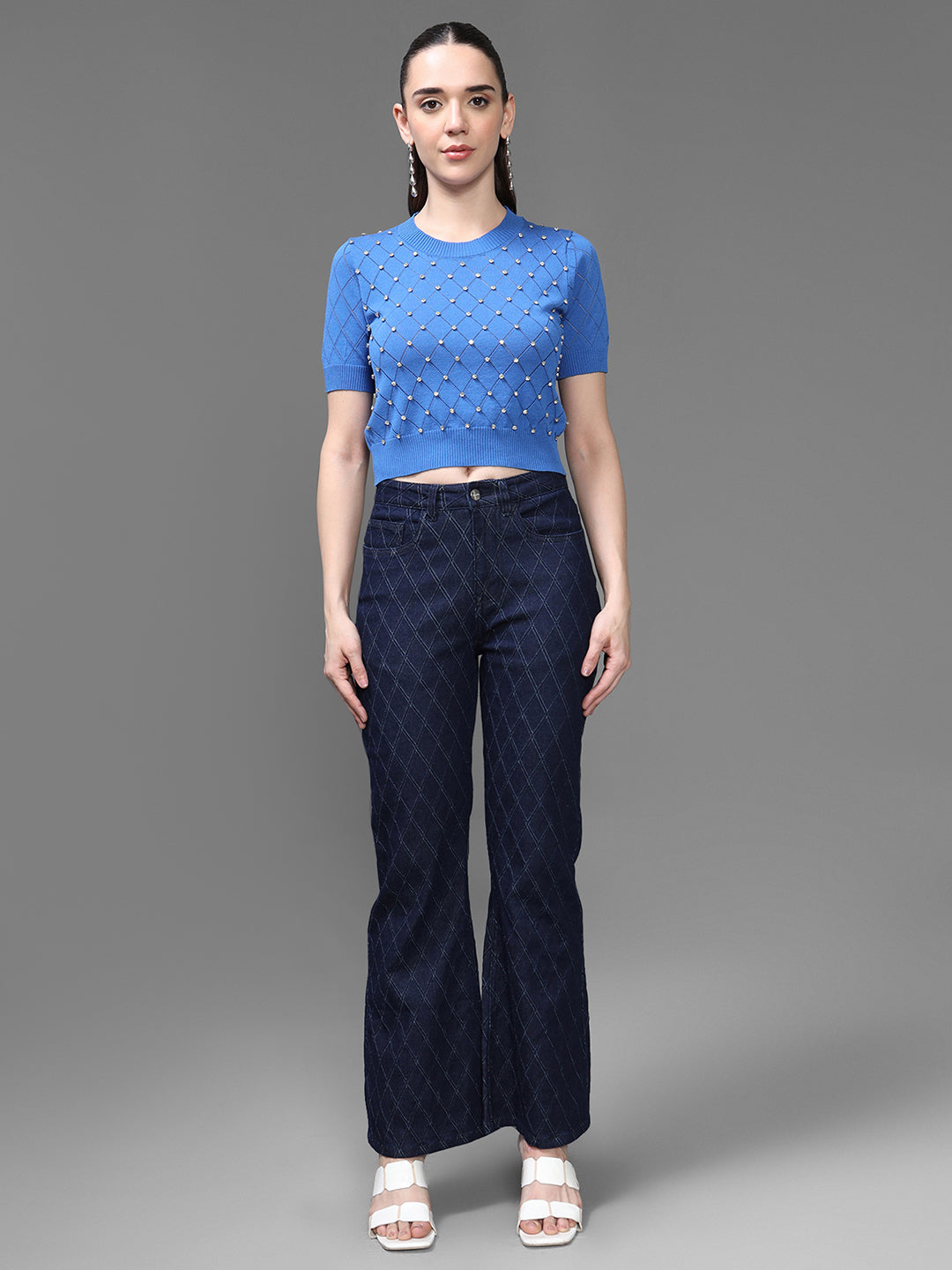 Radiate charm and sophistication with the Jarvis Top, a perfect blend of classic elegance and modern flair. Crafted in a soft powder blue knit, it features intricate diamond-pattern detailing adorned with delicate pearl embellishments, adding a touch of understated glamour. The round neckline and short sleeves offer a timeless silhouette, while the stretch-knit fabric ensures a comfortable and flattering fit. Ideal for both casual and semi-formal settings, this top pairs effortlessly with tailored pants, skirts, or denims. The Jarvis Top is a must-have statement piece for those who love refined simplicity with a luxe edge.