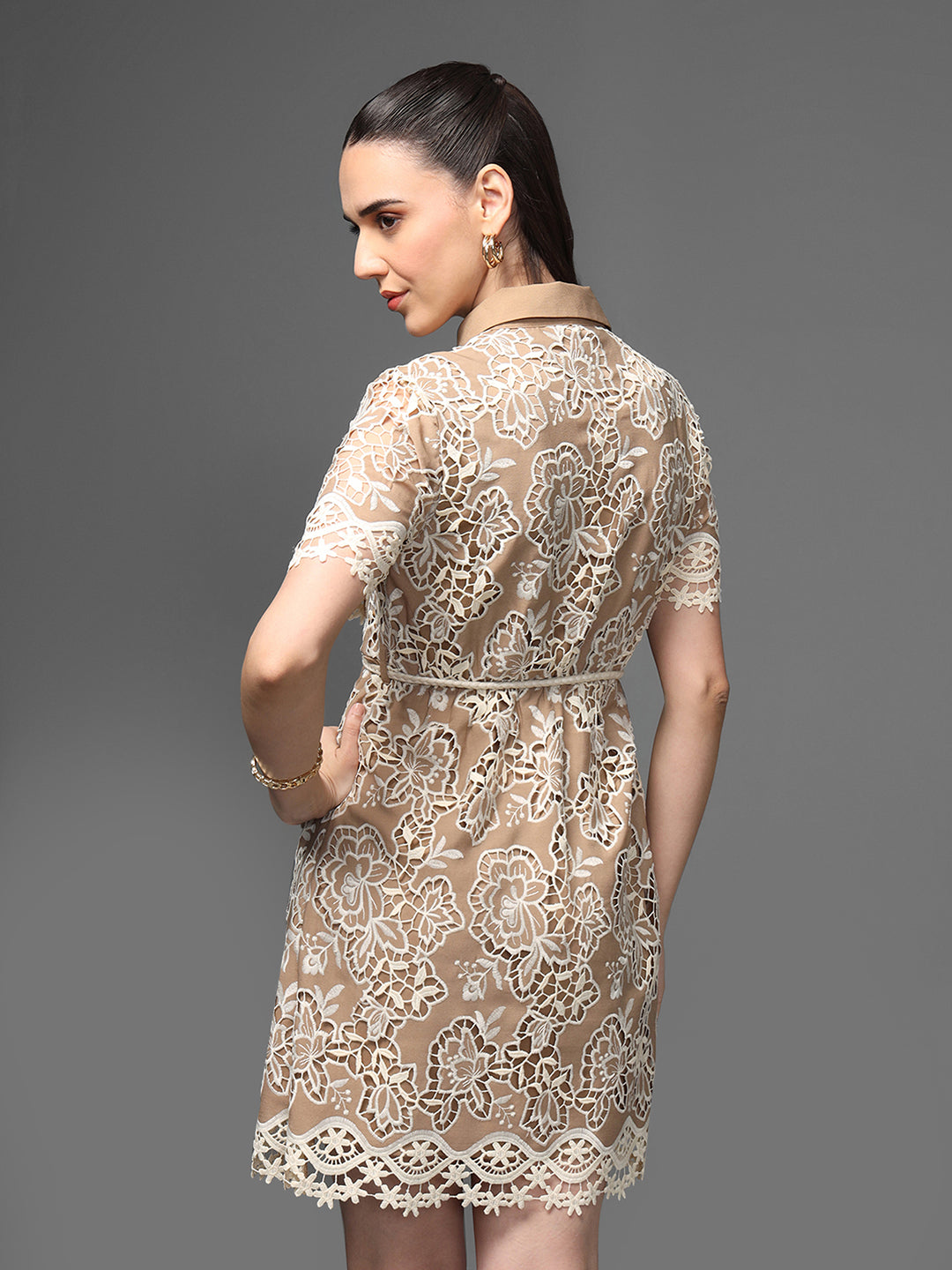 The Miller Mini Dress With Belt Is Where Effortless Charm Meets Modern Sophistication. Crafted In A Delicate Lace Fabric With Intricate Floral Patterns, This Dress Radiates Femininity And Grace. The Soft Beige Hue Enhances Its Romantic Appeal, Making It Perfect For Both Day And Evening Occasions. Featuring A Classic Shirt Collar, Short Sleeves, And A Button-Down Front, It Combines Structure With Fluidity. The Waist Tie Belt Cinches The Silhouette, Creating A Flattering, Defined Shape. Style The Miller Mini Dress With Nude Heels And Subtle Jewelry For A Timeless, Elegant Look.