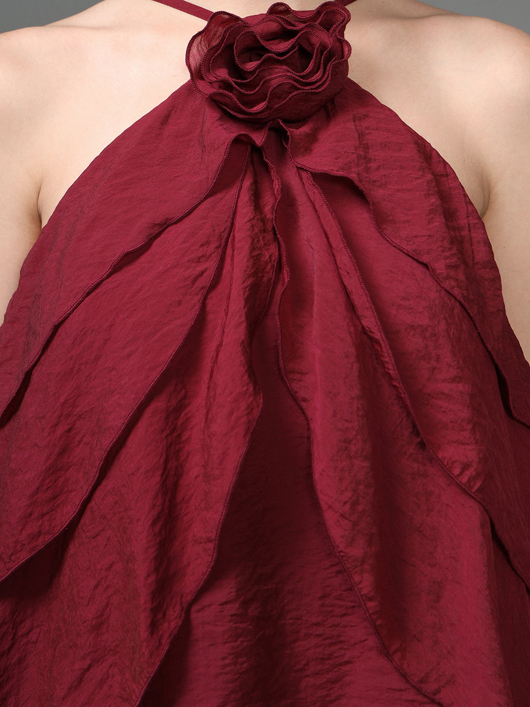 A statement sleeveless blouse featuring a dramatic layered petal front and a high halter neckline. Designed in a rich berry tone, the Athena Blouse adds sculptural elegance to any evening look with its soft cascade and structured silhouette.