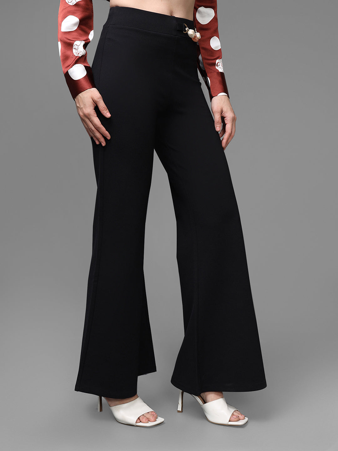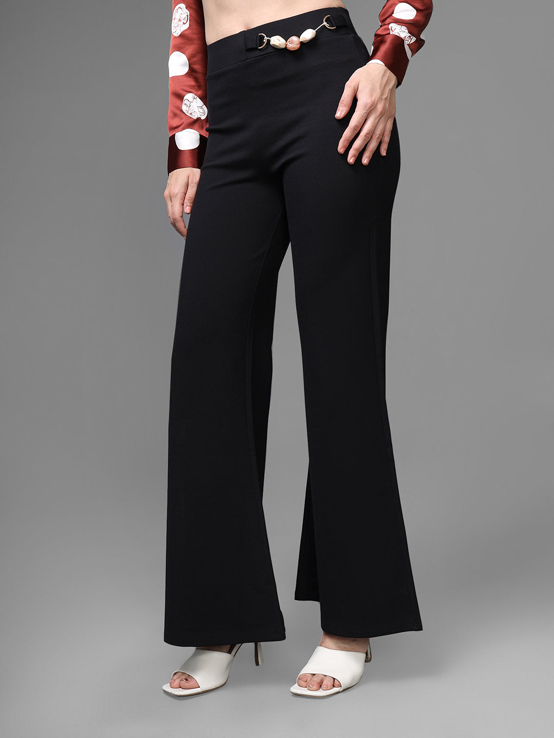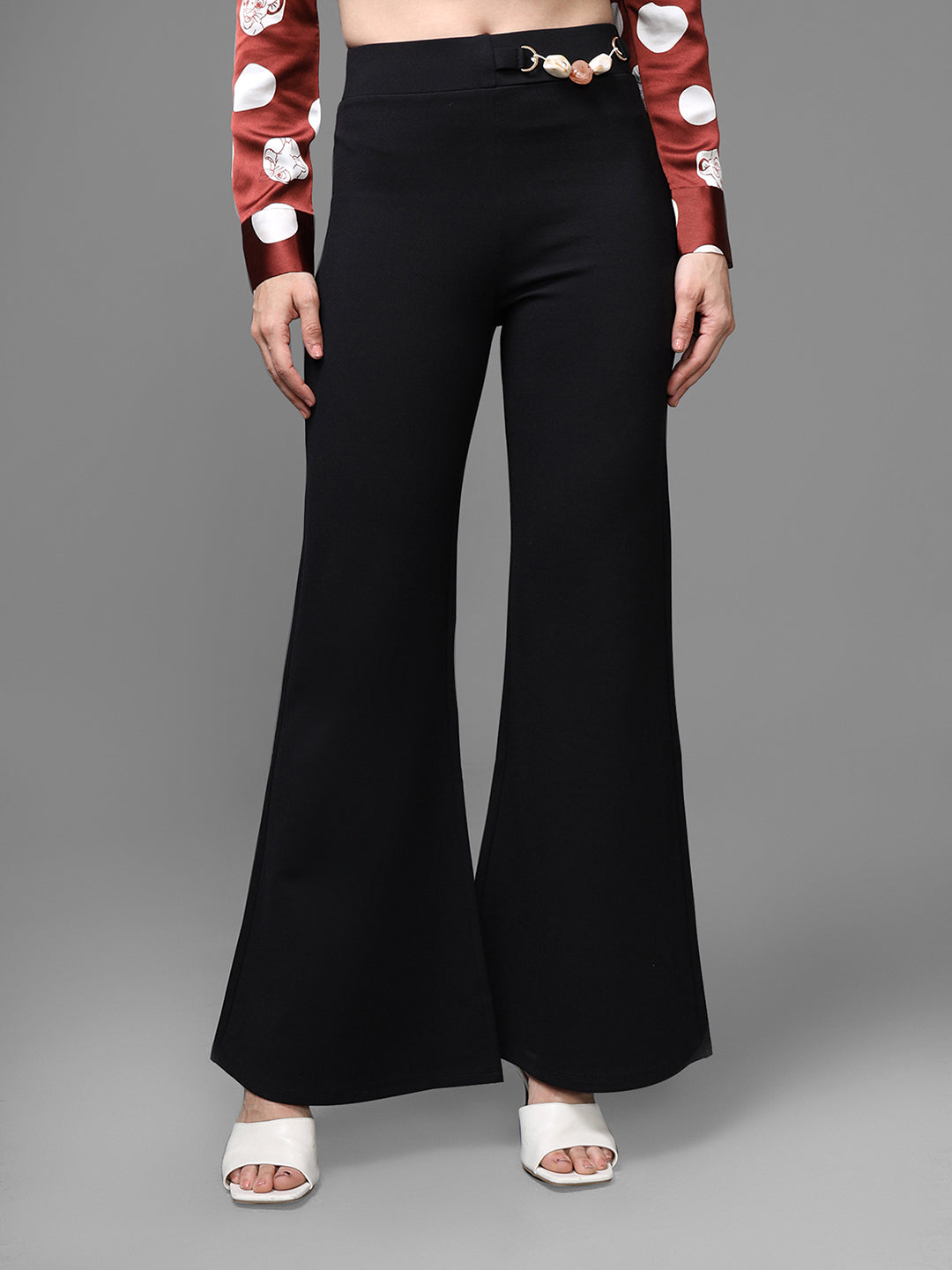 The Mateo Flared Jeggings redefine modern glamour with a sleek, body-hugging silhouette that flares gracefully at the hem. Crafted in a structured stretch fabric, these jeggings offer a perfect blend of comfort and contouring fit. A gold-tone hardware accent at the waistband adds a sophisticated touch, elevating this minimal design with a hint of luxe. The mid-waist cut enhances the figure, while the flared bottom brings a retro-inspired yet contemporary flair. Pair the Mateo Flared Jeggings with a fitted blouse or a crop top for a chic, elongating look that transitions seamlessly from day to night.