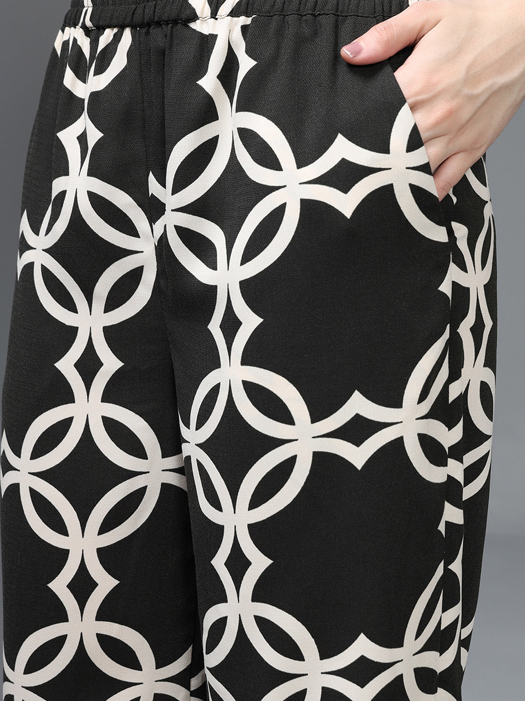 Effortlessly chic and comfortable, the Lombard Pull-On Pants redefine modern elegance. Featuring geometric print that mirrors the signature Lombard Shirt, these pants strike the perfect balance between statement style and everyday ease. Crafted from a smooth, fabric, they offer a flattering mid-waisted fit with a pull-on waistband for maximum comfort. The straight-leg silhouette elongates the frame, making them versatile enough for both workwear and casual occasions. Pair the Lombard Pull-On Pants with the Lombard Shirt for a coordinated, polished ensemble or style them with a solid top for a balanced, refined look.