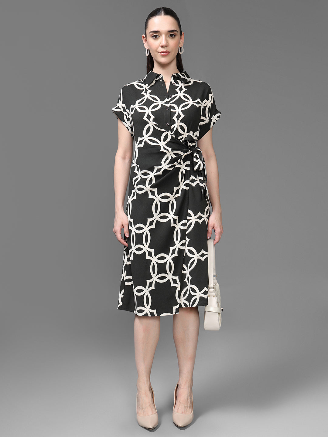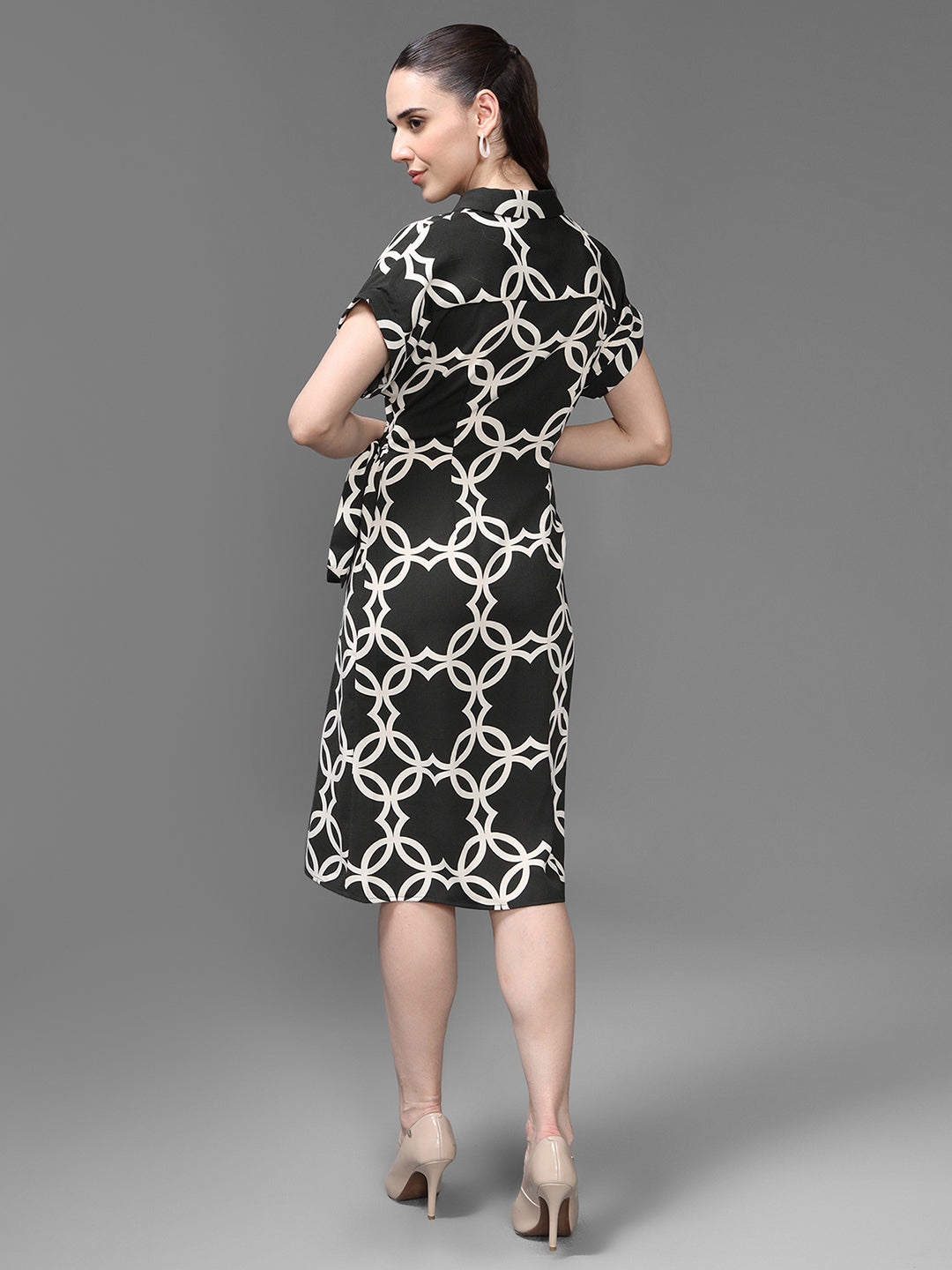 The Lombard Midi Dress captures timeless sophistication with a bold, modern edge. Showcasing the signature geometric print on a deep base, this dress blends classic structure with contemporary style. Featuring a collared neckline, short sleeves, and a button-down front, it exudes understated elegance. The self-tie waist belt cinches the silhouette, offering a flattering fit that enhances the waistline. Crafted from smooth, breathable fabric, it ensures all-day comfort with a refined finish. Perfect for both work and after-hours occasions, the Lombard Midi Dress is a wardrobe essential for effortless polish.