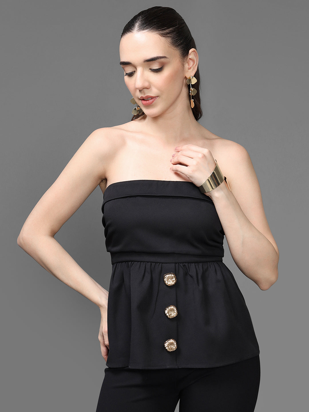 The Ontario Strapless Blouse redefines minimalist elegance with a sleek and contemporary silhouette. Crafted in a deep black, this top features a structured strapless neckline and a gently flared hem, creating a flattering, feminine shape. Made from smooth, stretchable fabric, it ensures a comfortable fit while maintaining a polished look. Perfect for layering or wearing solo, this blouse transitions seamlessly from day to evening. Pair the Ontario Strapless Blouse with tailored trousers for an elevated office look or with a midi skirt for an effortlessly chic evening ensemble.