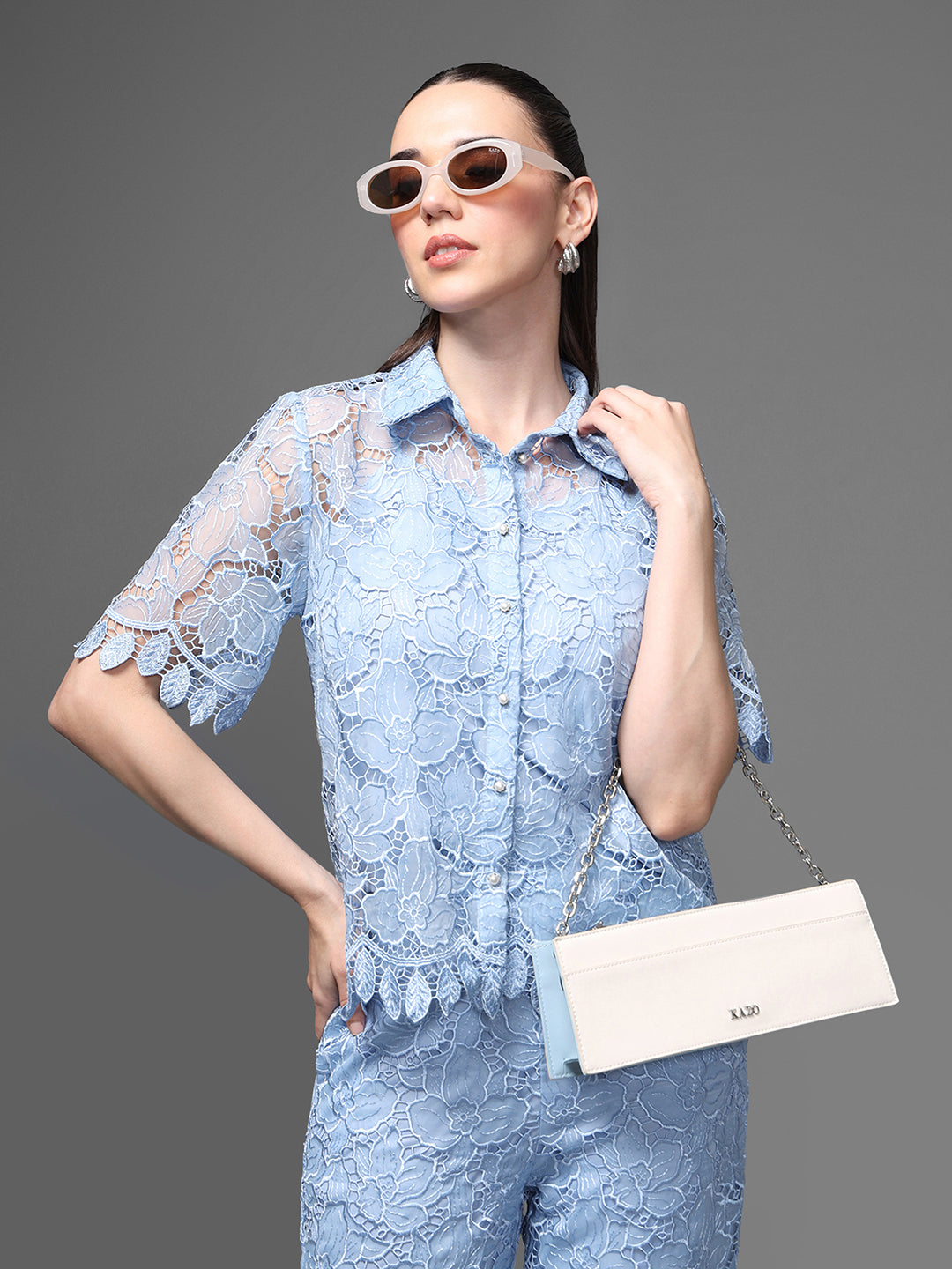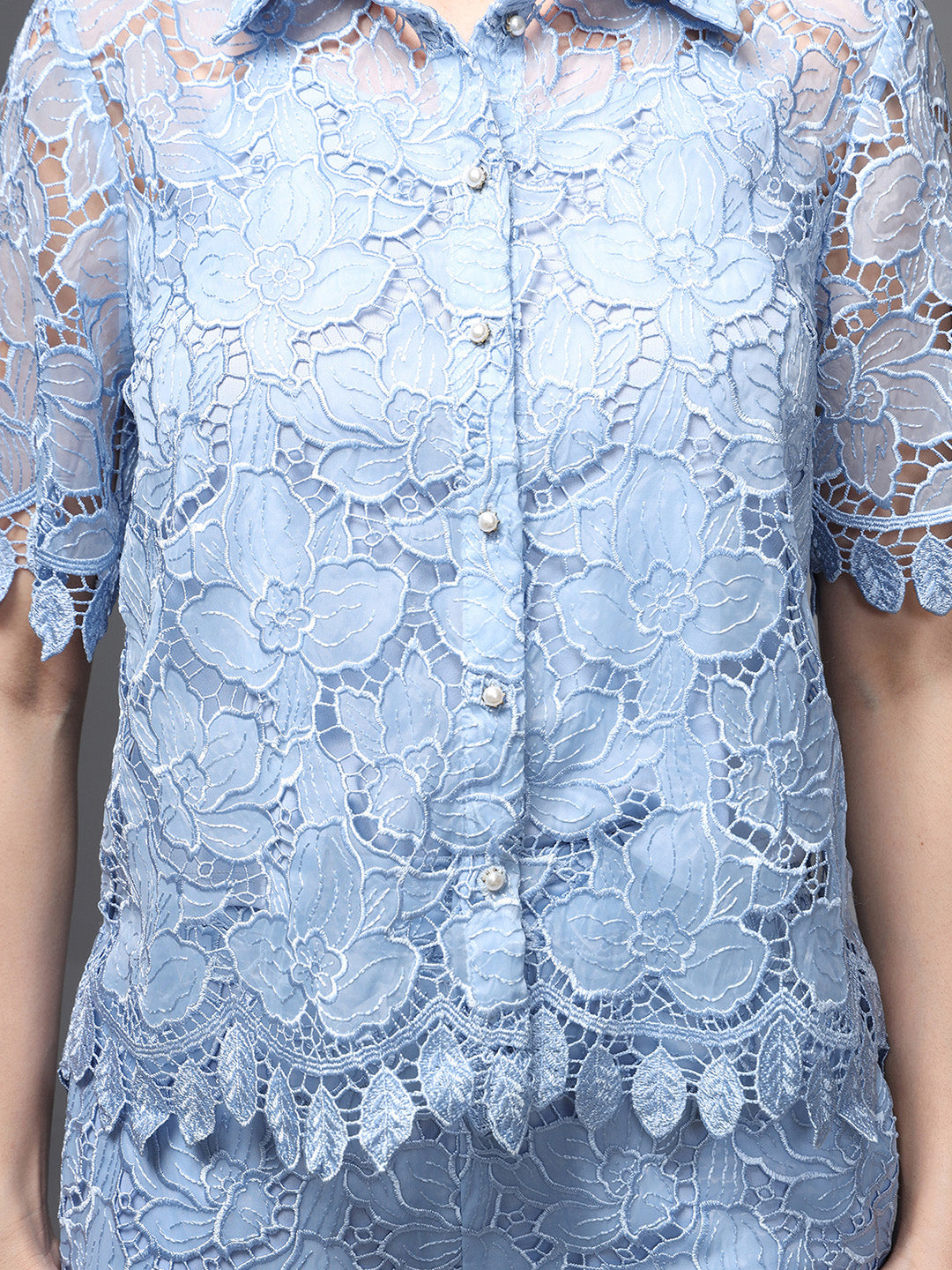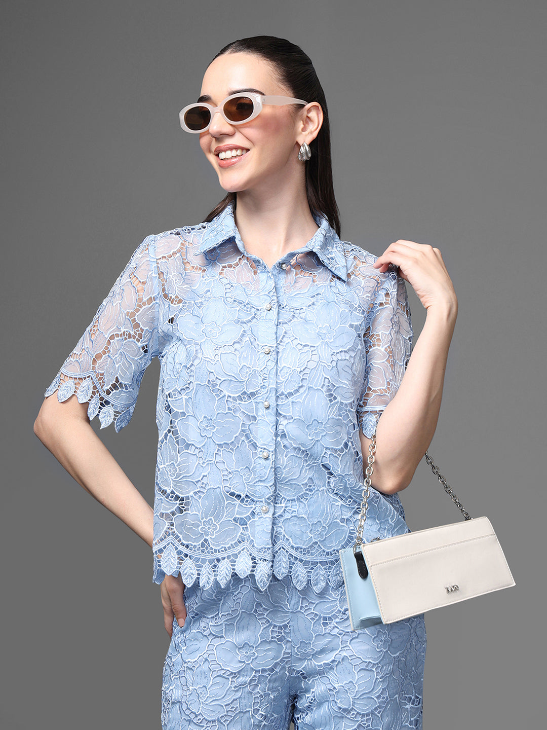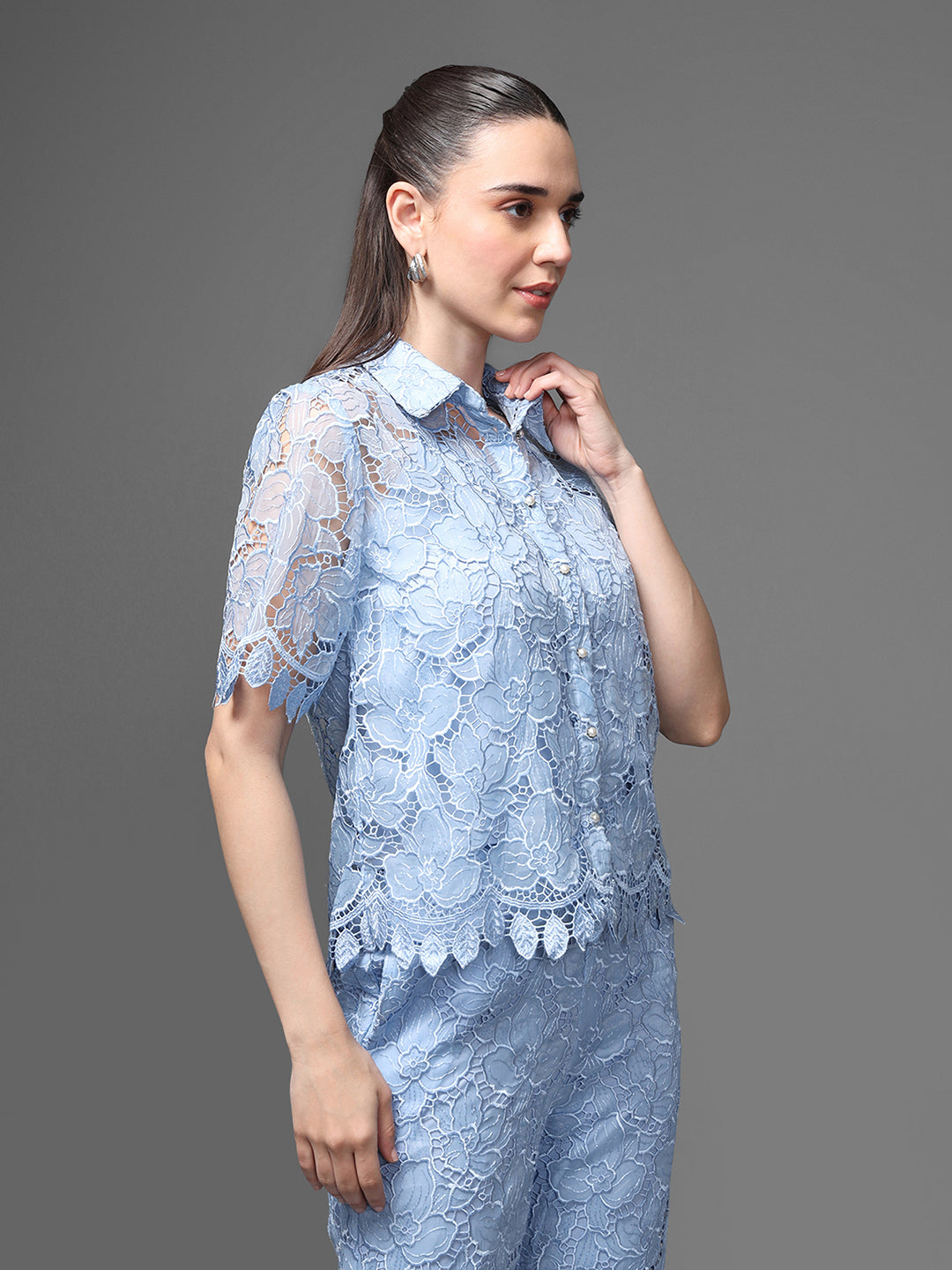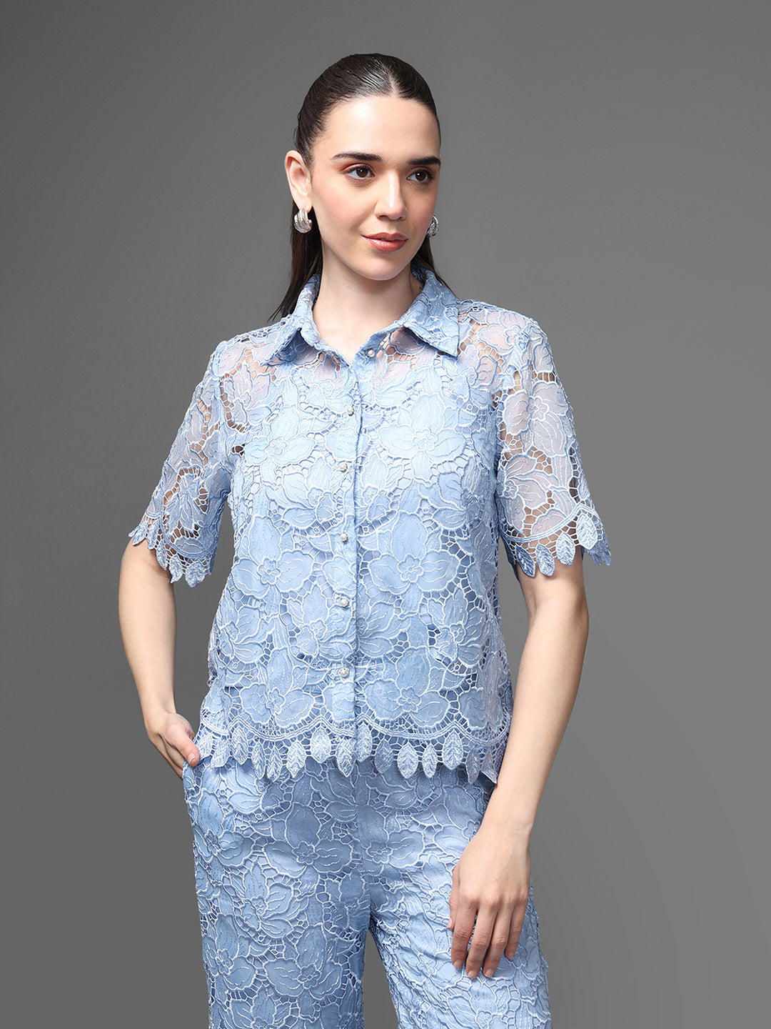 A Delicate Sky-Blue Lace Shirt Crafted With Intricate Floral Patterns, Offering A Soft, Feminine Look. Designed With A Classic Collar, Scalloped Hem, And Short Sleeves, This Piece Brings Elegance And Modern Charm To Any Wardrobe. Perfect For Pairing With Tailored Pants, Skirts, Or Layered Under A Blazer For Elevated Sophistication.