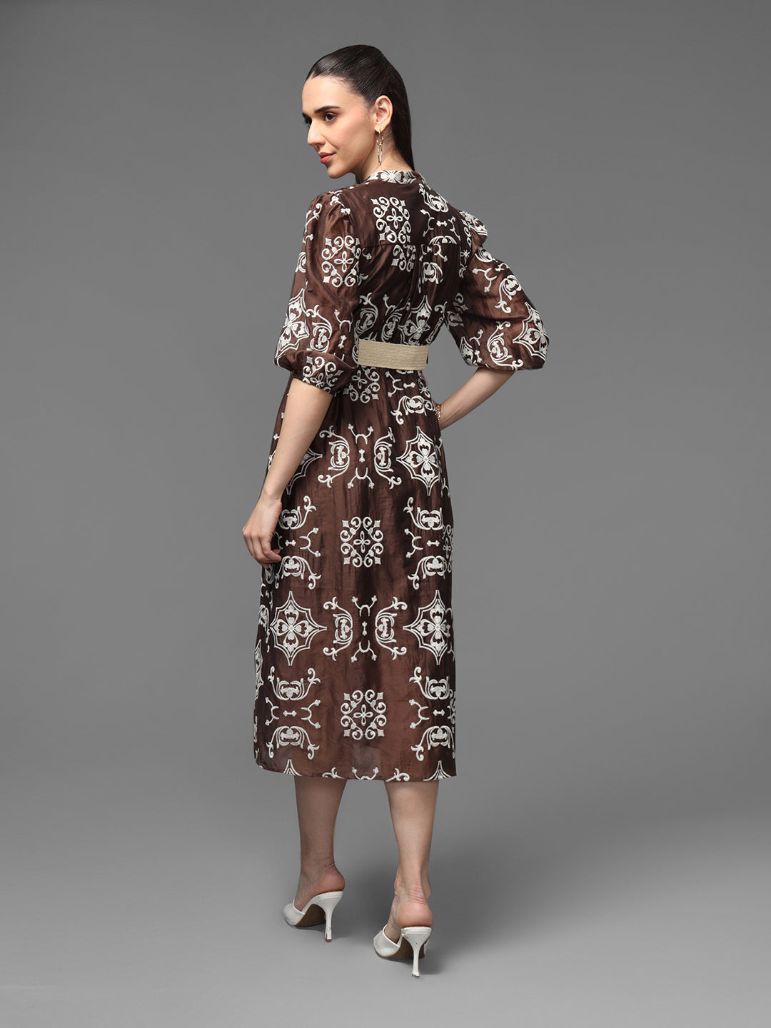 The Cabo Midi Dress Blends Artisanal Embroidery With A Relaxed, Effortless Silhouette. Designed In A Rich Earthy Tone, This Dress Showcases An All-Over Abstract Floral Motif That Elevates Its Bohemian Charm. The Gathered Puff Sleeves, Soft Mandarin V-Neckline, And The Contrasting Belt At The Waist Shape The Body Beautifully While Keeping The Look Comfortable And Easy To Wear. Perfect For Daytime Outings, Vacations, Brunch Dates Or Resort Wear, This Dress Is A Statement Piece That Combines Comfort With Detailed Craftsmanship.