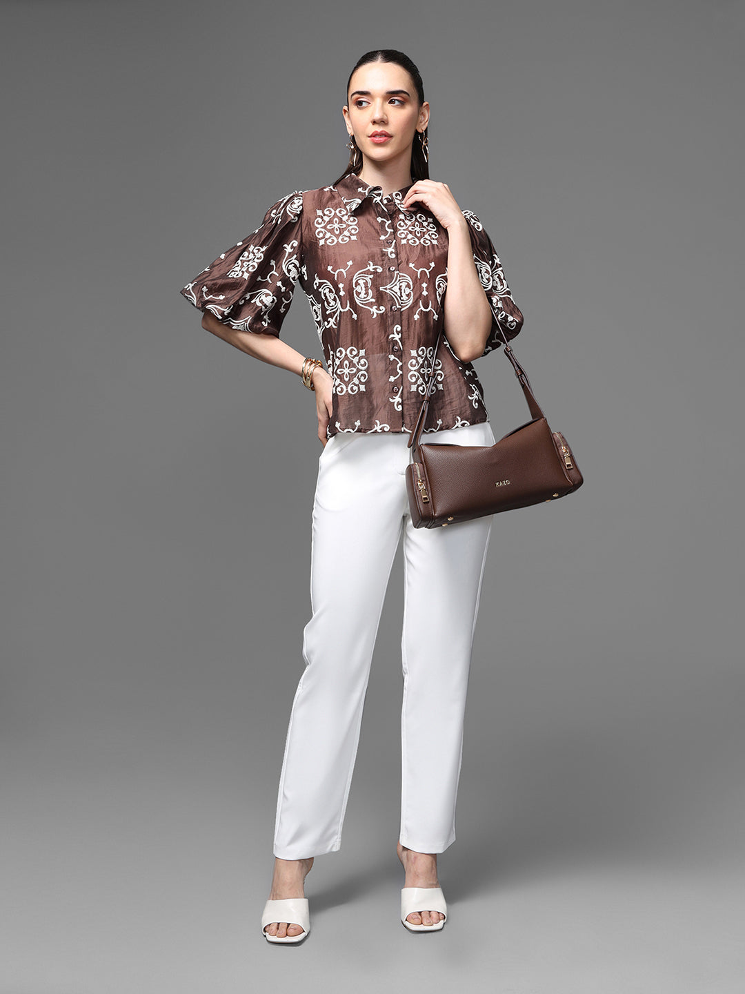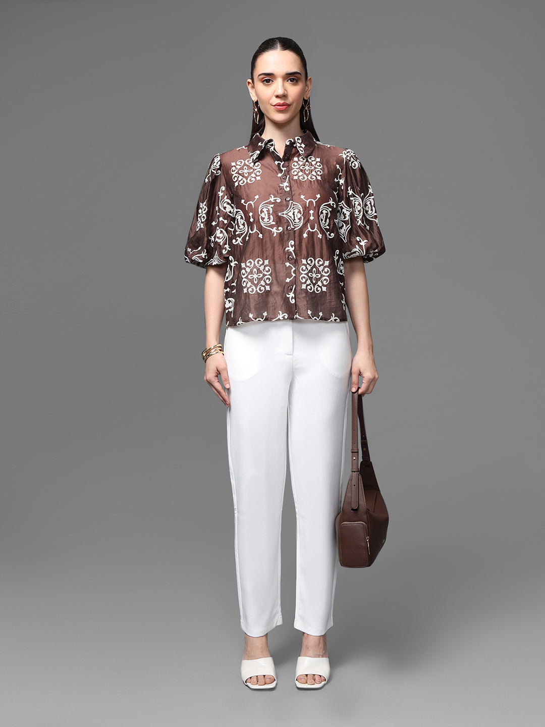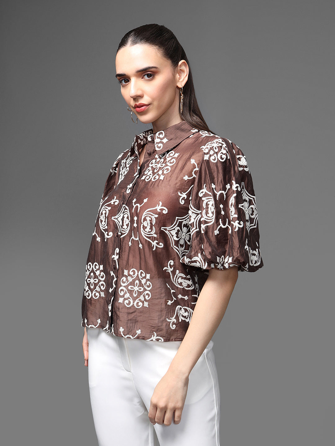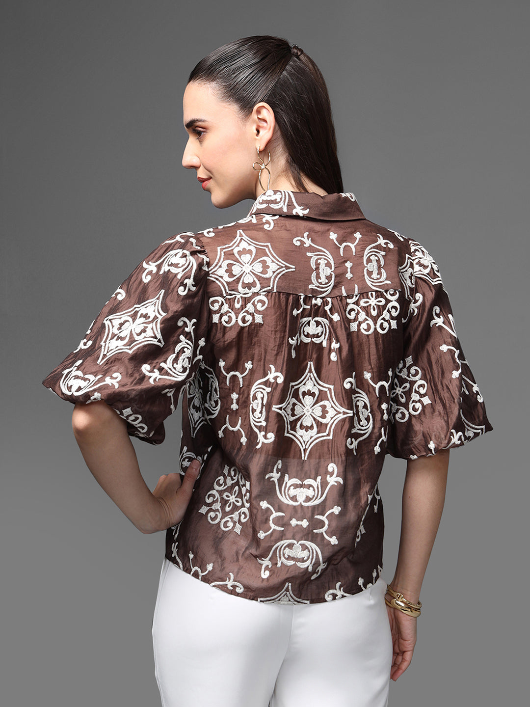 The Cabo Shirt Features A Bold, Moroccan-Inspired Embroidered Pattern In A Rich Brown-And-Ivory Palette, Creating A Statement Look Rooted In Contemporary Ease. Designed With Soft Puff Sleeves, A Structured Collar, And A Front-Button Closure, It Balances Playful Volume With Refined Detailing. This Versatile Piece Adds A Fresh, Artisanal Touch To Both Casual And Polished Outfits.