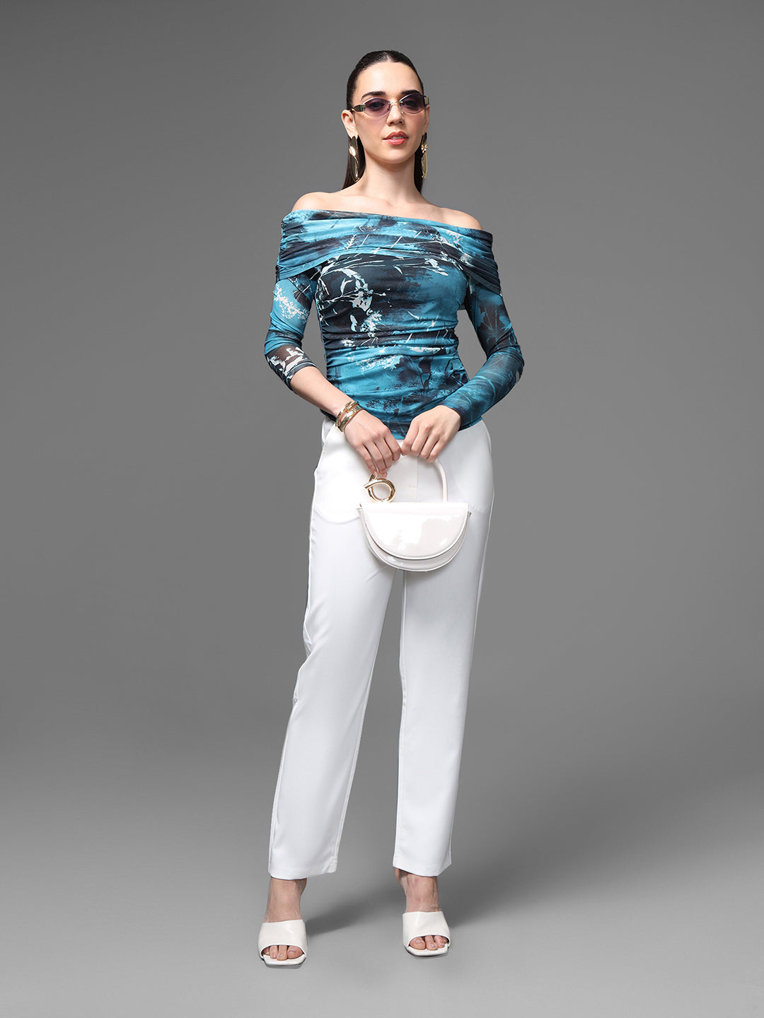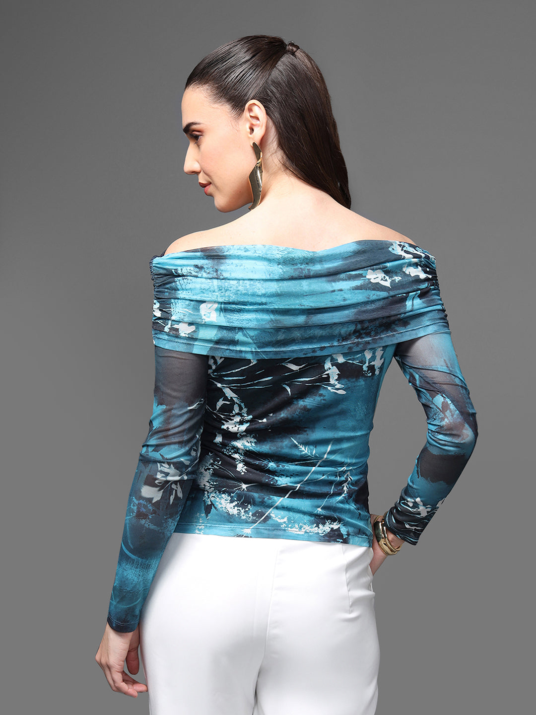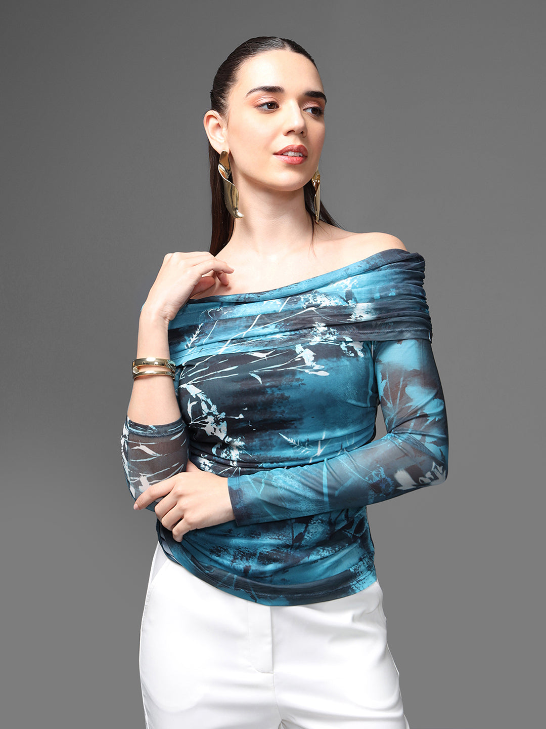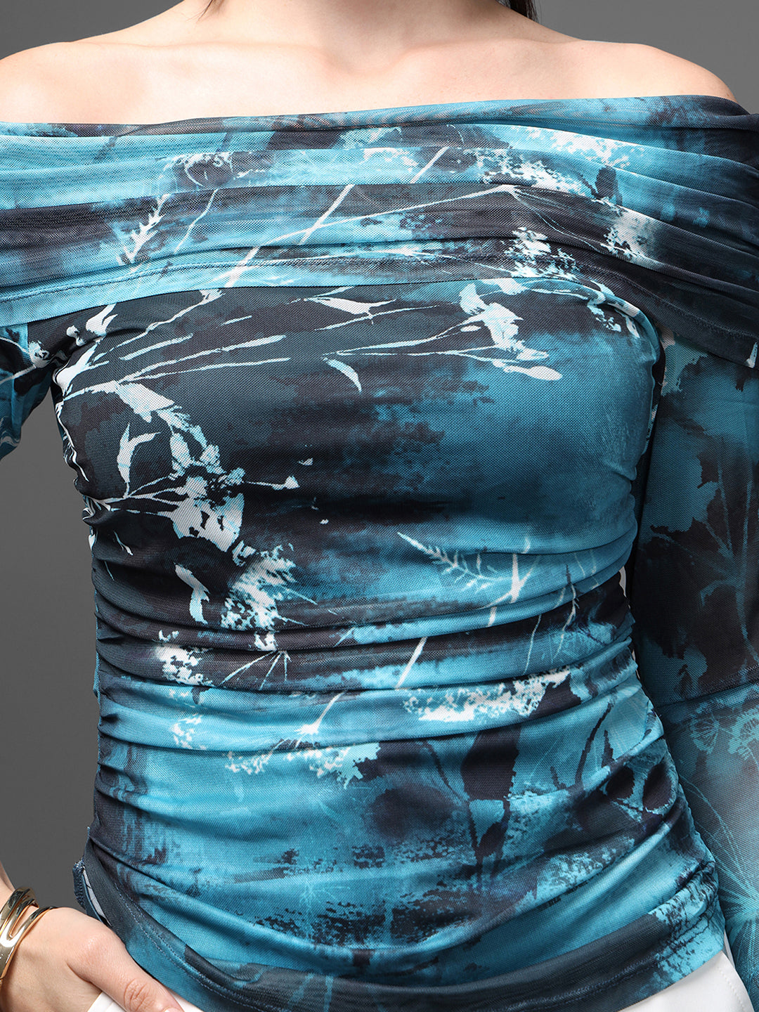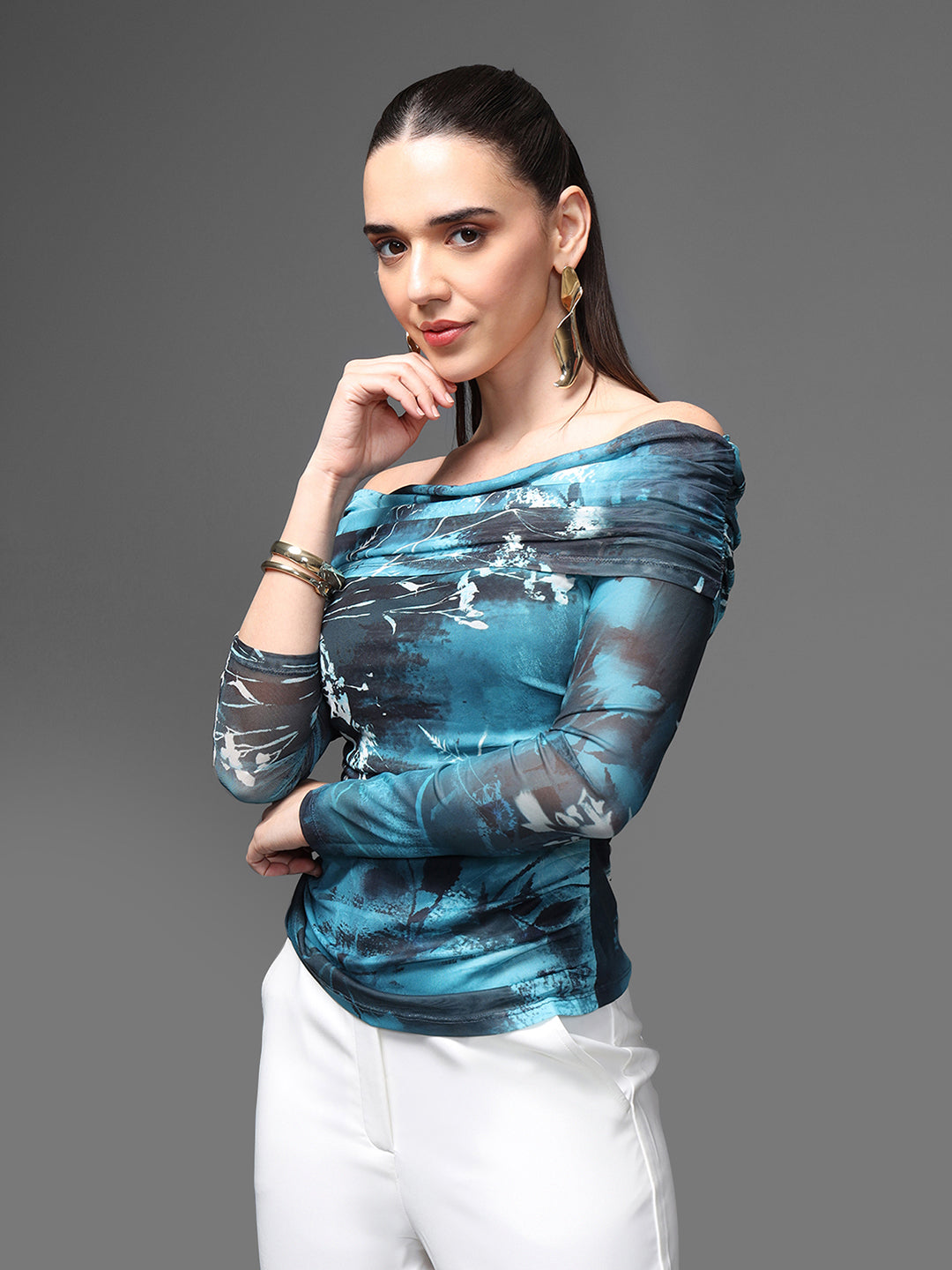 A Striking Off-Shoulder Fitted Top Featuring A Deep Ocean-Inspired Abstract Print. Designed With Full Sleeves And A Body-Hugging Silhouette, This Top Blends Elegance With A Bold, Contemporary Edge—Perfect For Evening Looks Or Statement Styling.