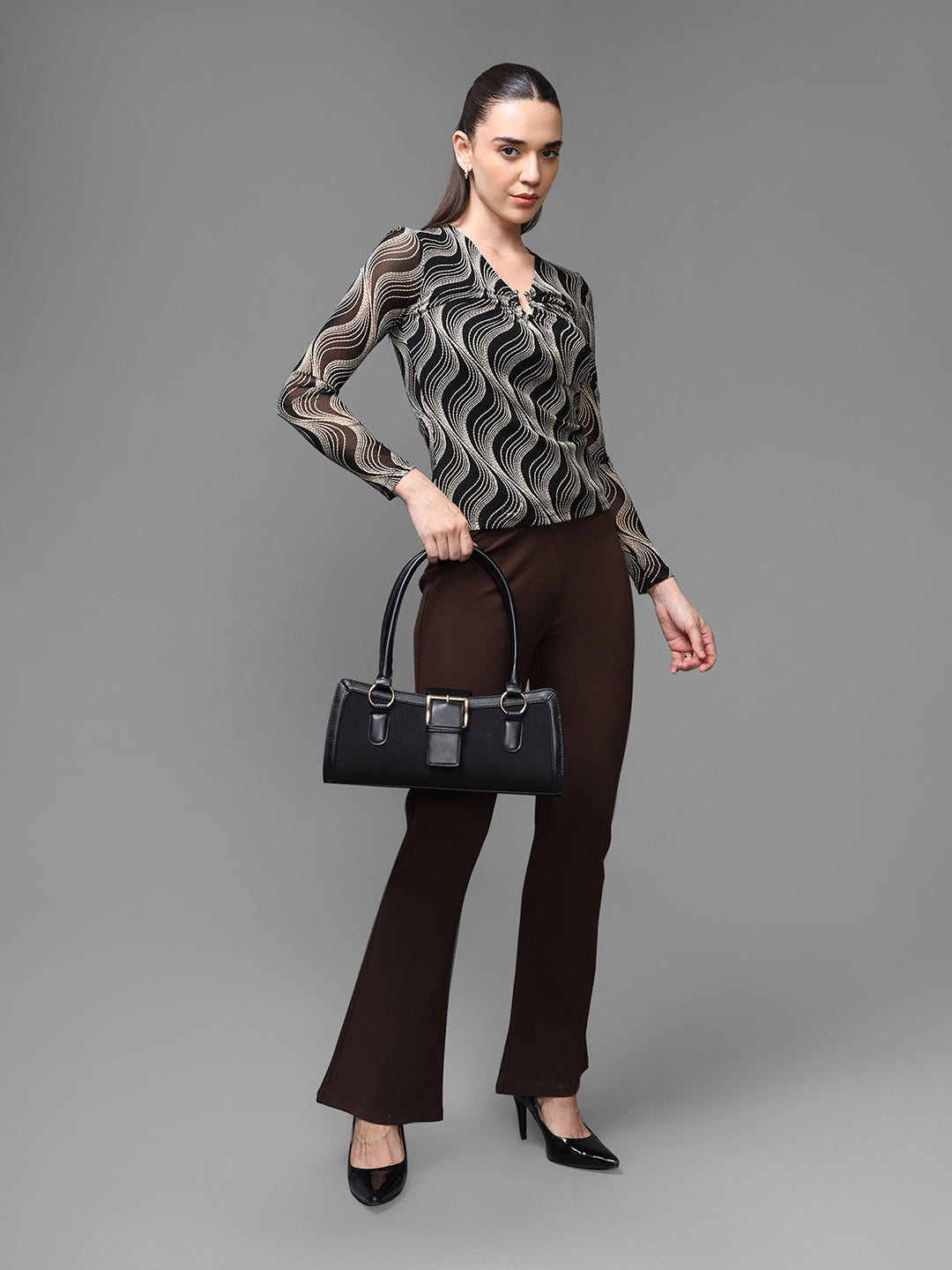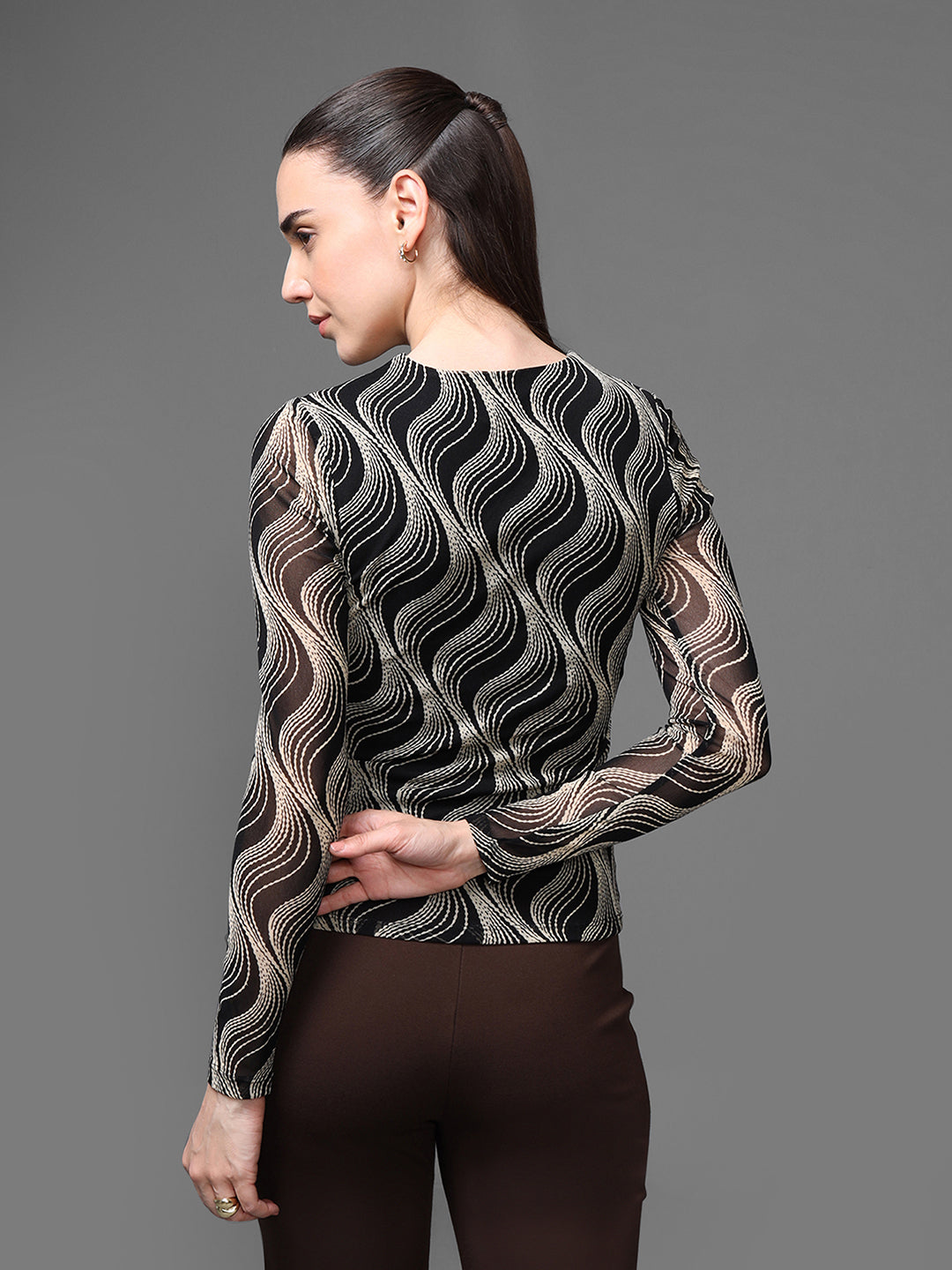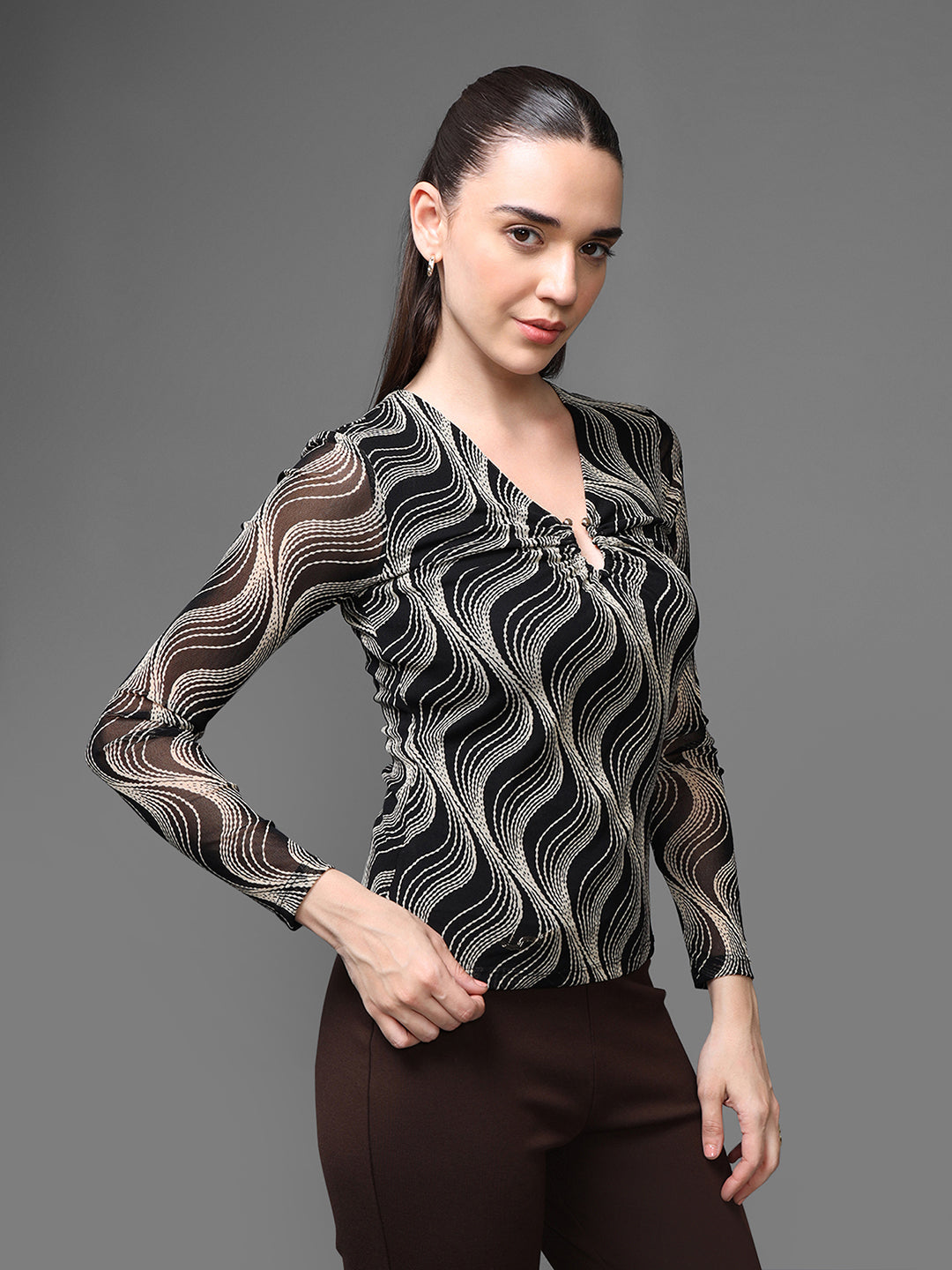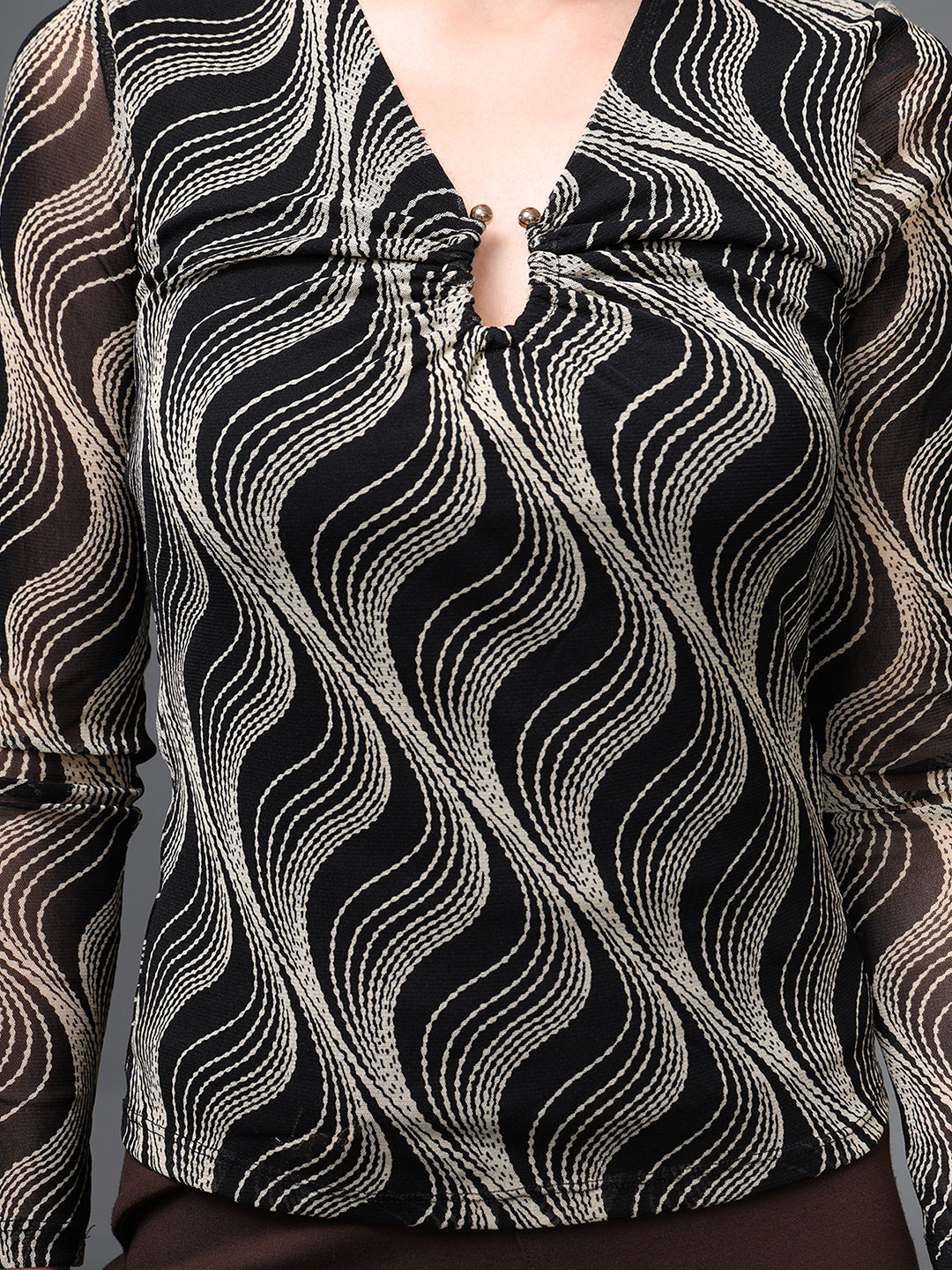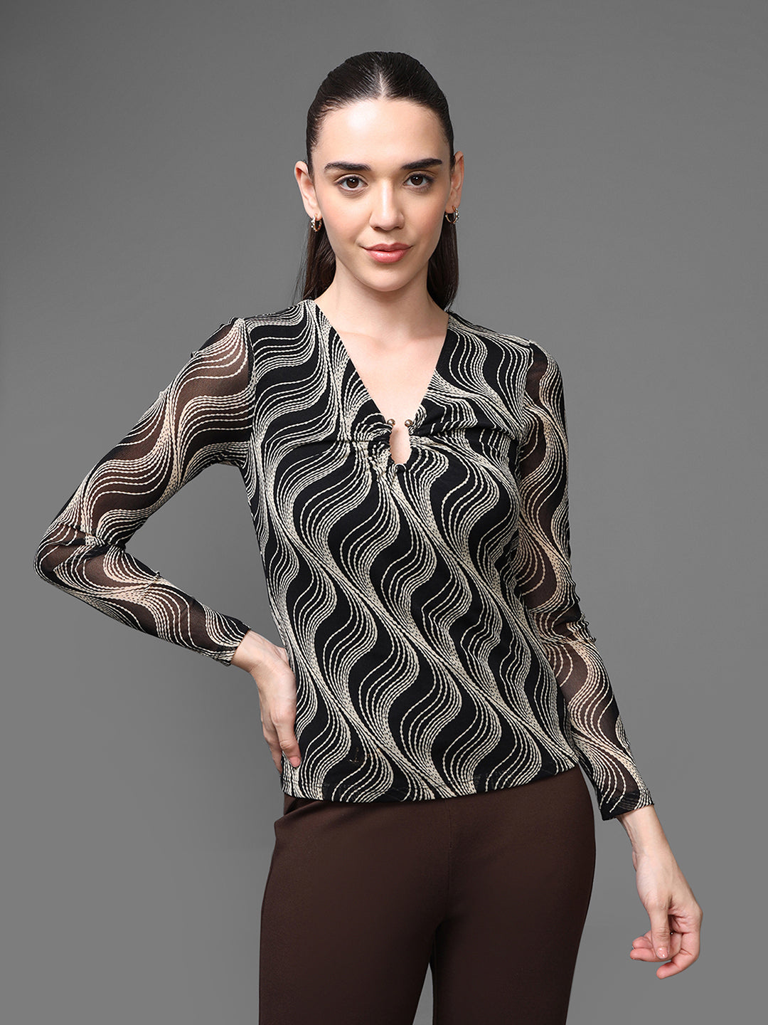 This flowing Plaza Top features an eye-catching wavy abstract pattern in beige over a deep black base, giving it a modern and elevated look. Designed with a soft V-neckline highlighted by delicate gold-tone detailing at the centre, the silhouette drapes beautifully for an effortlessly chic appearance. Lightweight, semi-sheer sleeves add a refined touch—perfect for evening outings or dressy casual styling.