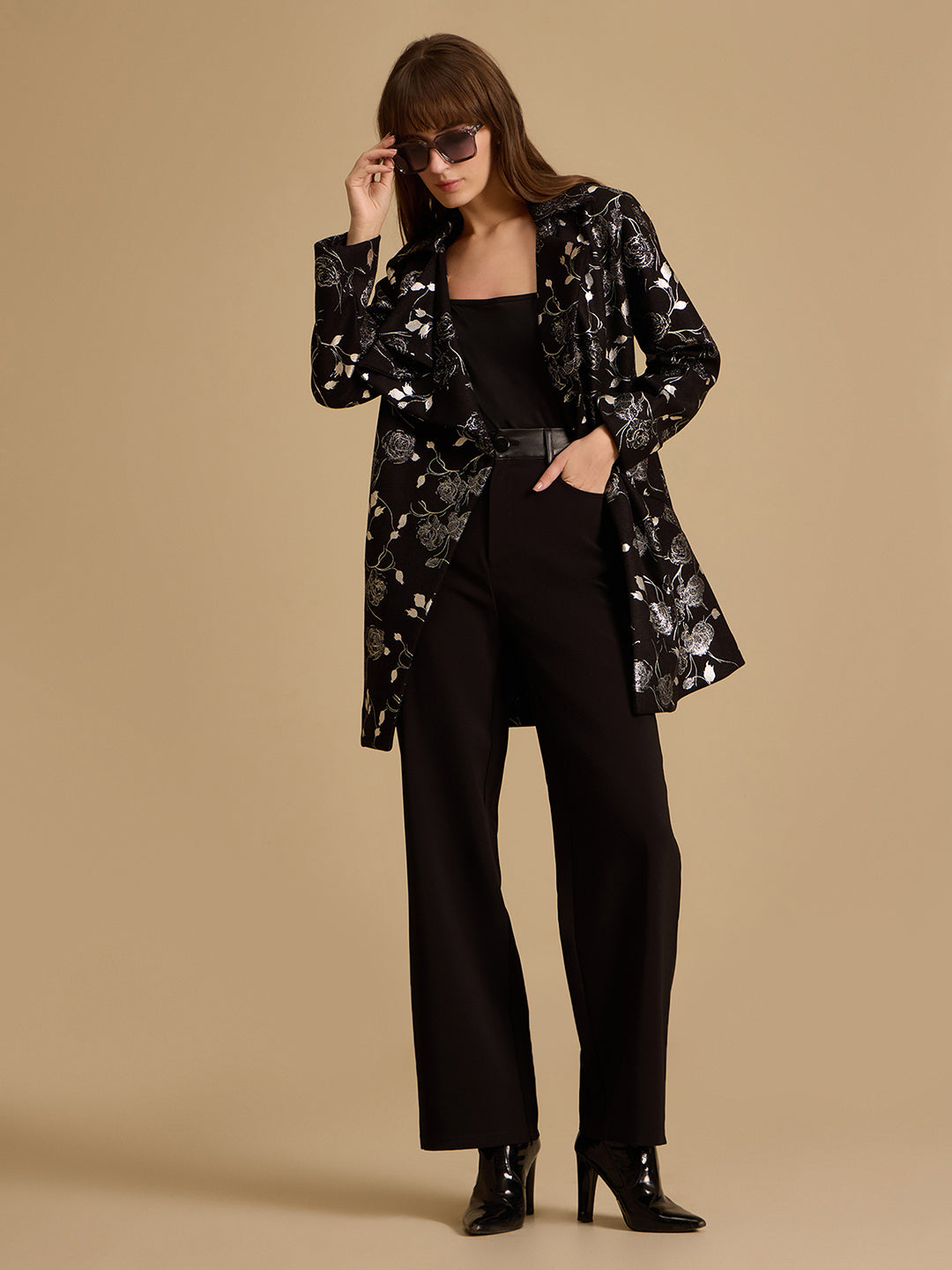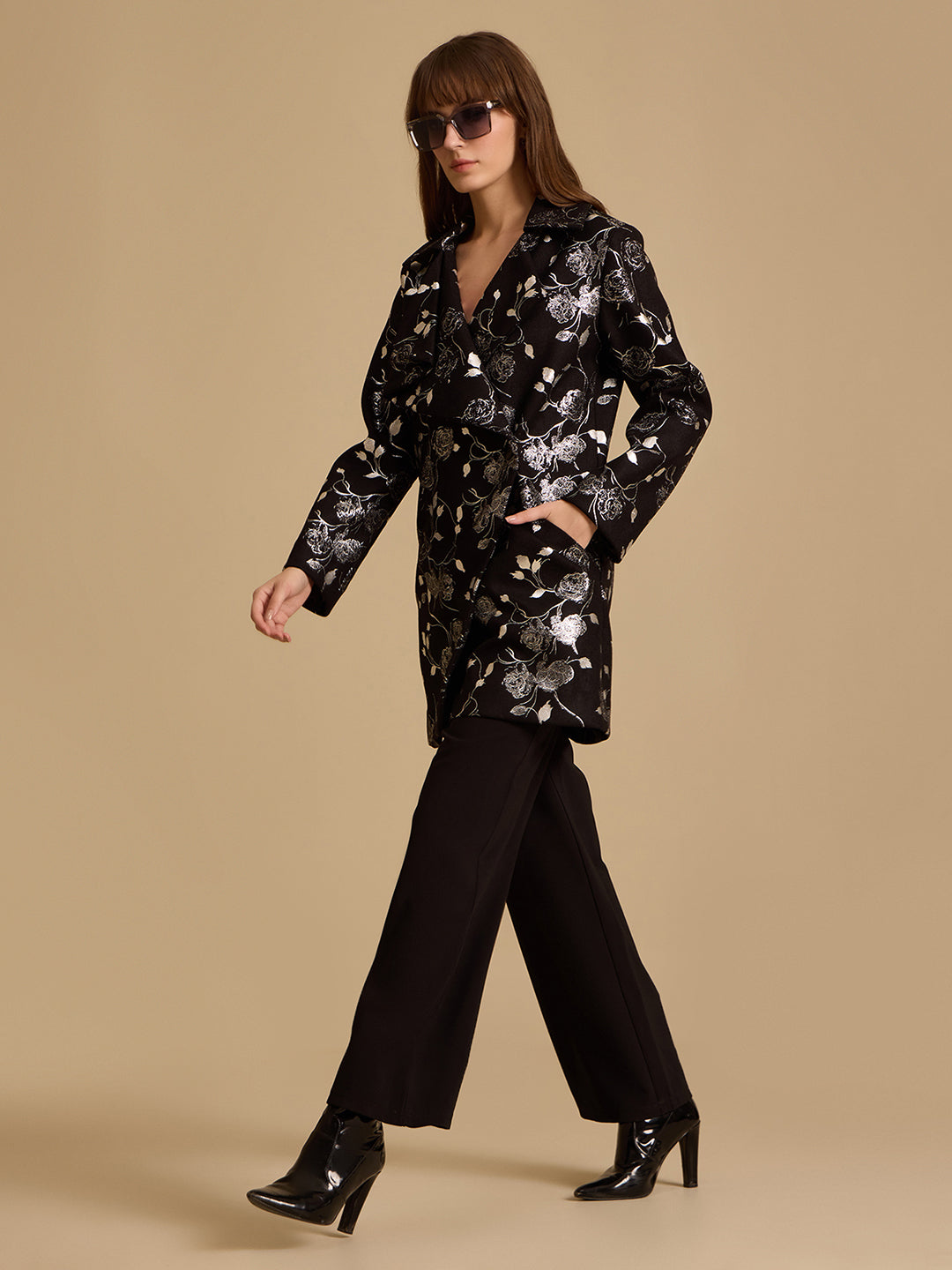 The Printed Felt Overcoat is a striking outerwear piece perfect for winter! It features a beautiful floral patterned foil detail that adds a touch of elegance. The overlap detail enhances its chic silhouette, while the full sleeves provide warmth and comfort. Ideal for layering over your favorite outfits, this overcoat is sure to make a stylish statement during the colder months. Perfect for both casual and dressy occasions!