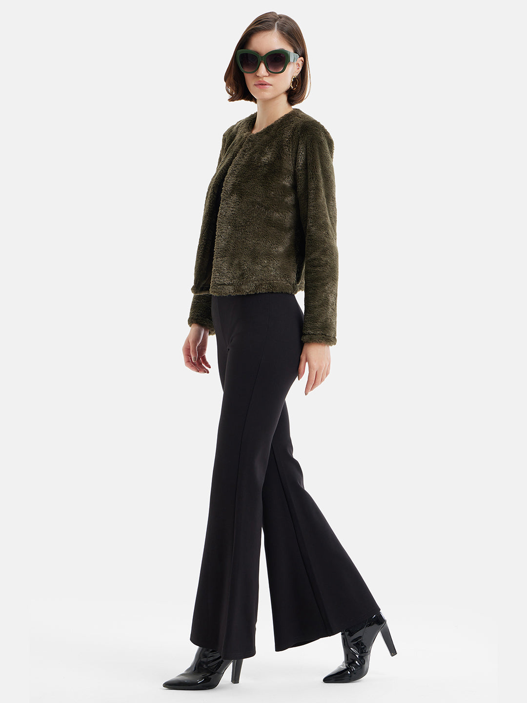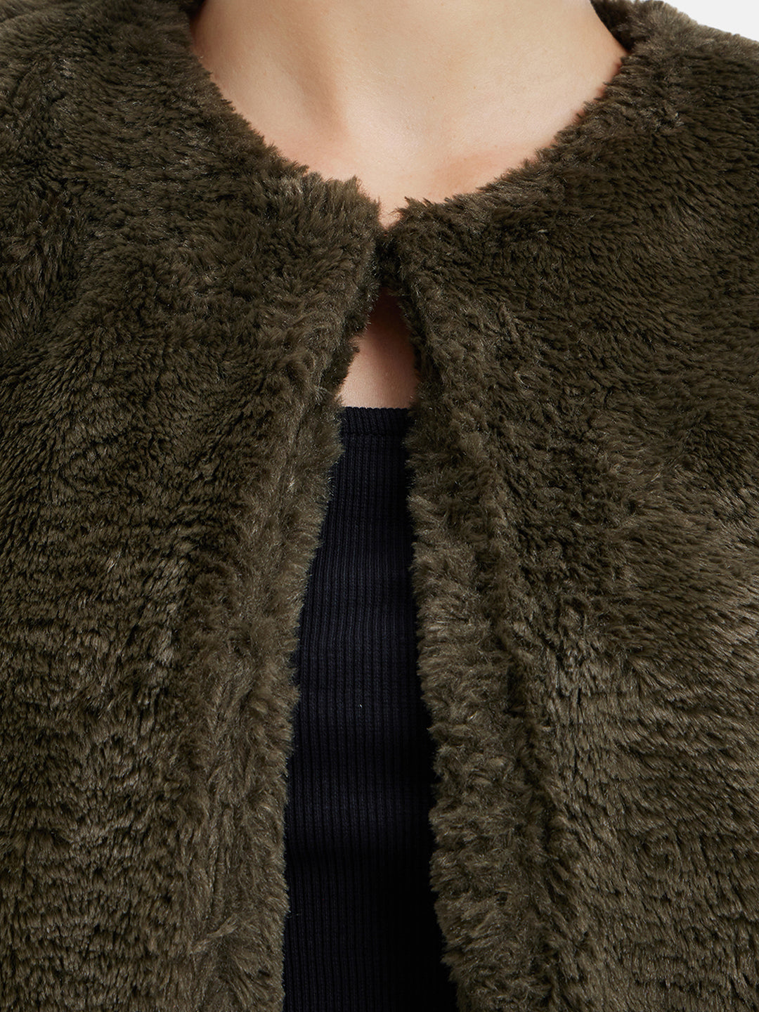 Stay cozy and stylish with this Olive Faux Fur Jacket. Made from soft, high-quality faux fur, it offers warmth with a luxurious feel. The rich olive tone adds a chic touch, while the collarless design and front hook closure create a sleek, modern silhouette. Perfectly cropped to flatter your frame, this jacket pairs effortlessly with dresses, high-waisted pants, or skirts. Ideal for elevating everyday looks or layering over evening outfits, it blends elegance and comfort seamlessly.