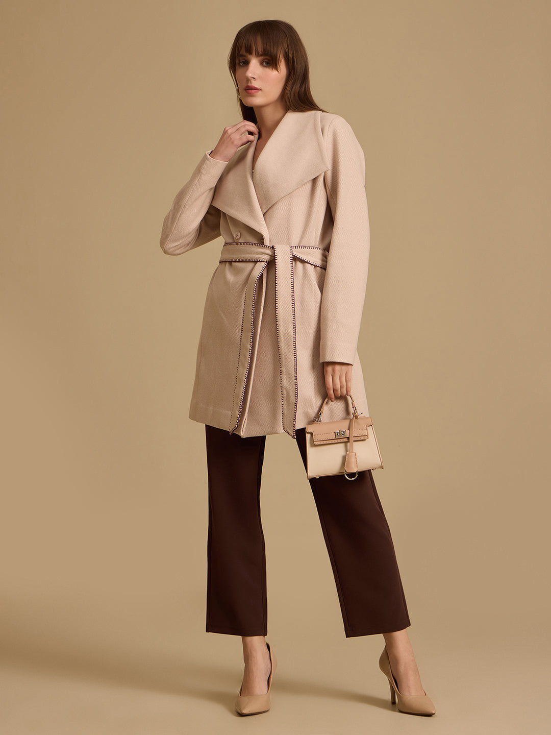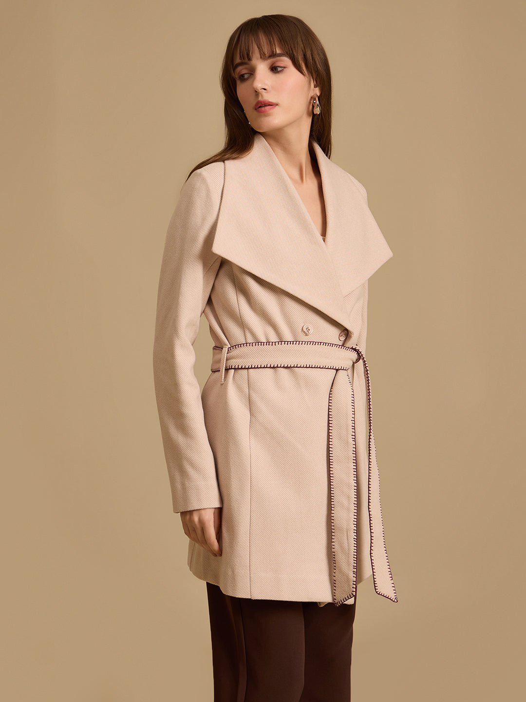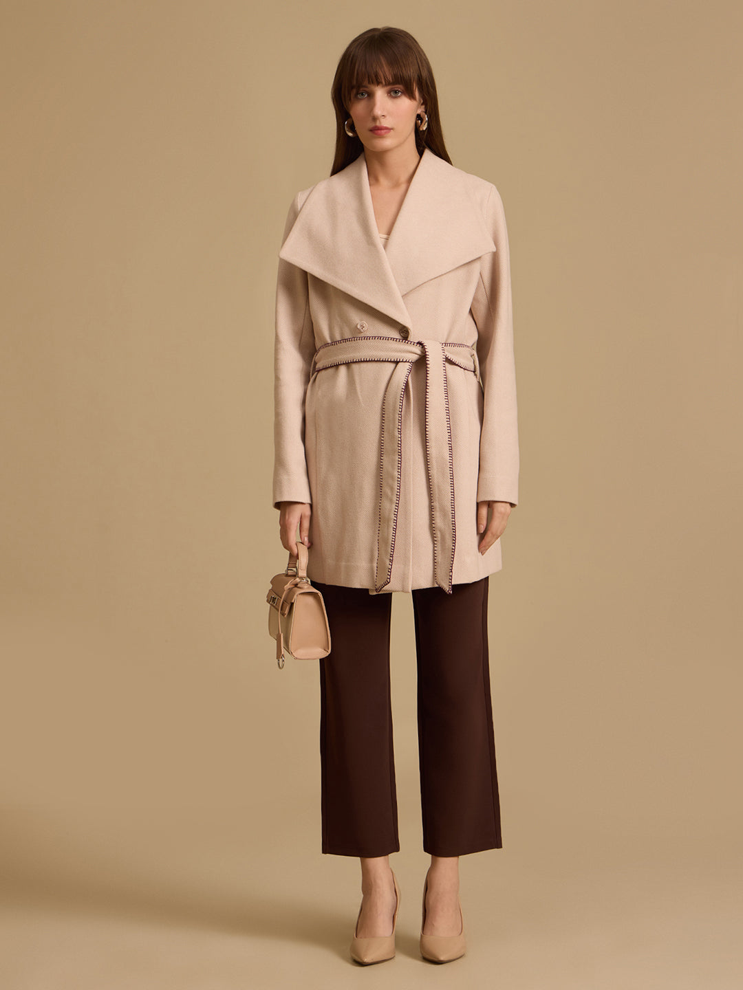 Stay stylishly warm this winter with our Twill Felt Overcoat with Belt in a soft light pink hue. This elegant overcoat features a sophisticated shawl lapel collar, adding a touch of refinement to your ensemble. Tailored for a flattering fit, it provides both comfort and warmth with its longline design and full sleeves. The front button closures offer a polished finish, while the coordinating belt cinches the waist for a beautifully structured silhouette. Crafted from warm woven felt, this overcoat is perfect for layering over your favorite outfits, making it a versatile addition to your winter wardrobe. Embrace effortless elegance and stay cozy all season long!
