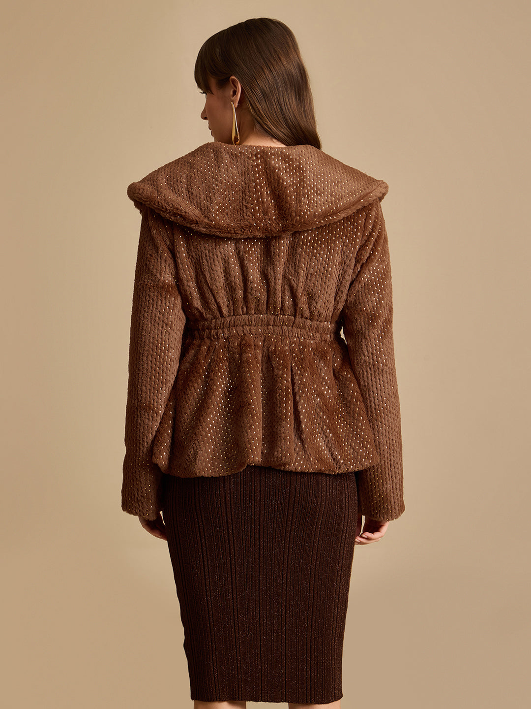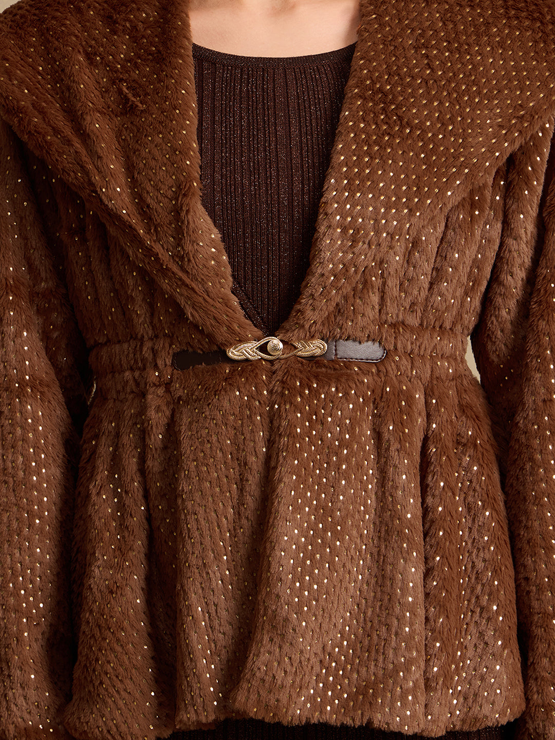 Elevate your winter wardrobe with our Foiled Fur Peplum Jacket. This stunning outerwear piece features a luxurious shawl collar and a chic peplum silhouette that flatters any figure. The front buckle detail adds a touch of sophistication, while the foiled fur fabric with gold trim ensures you’ll shine in any setting. Designed with full sleeves for warmth and style, this jacket effortlessly blends elegance and comfort, making it the perfect choice for both casual outings and special occasions. Embrace the cold season with confidence in this statement-making jacket.