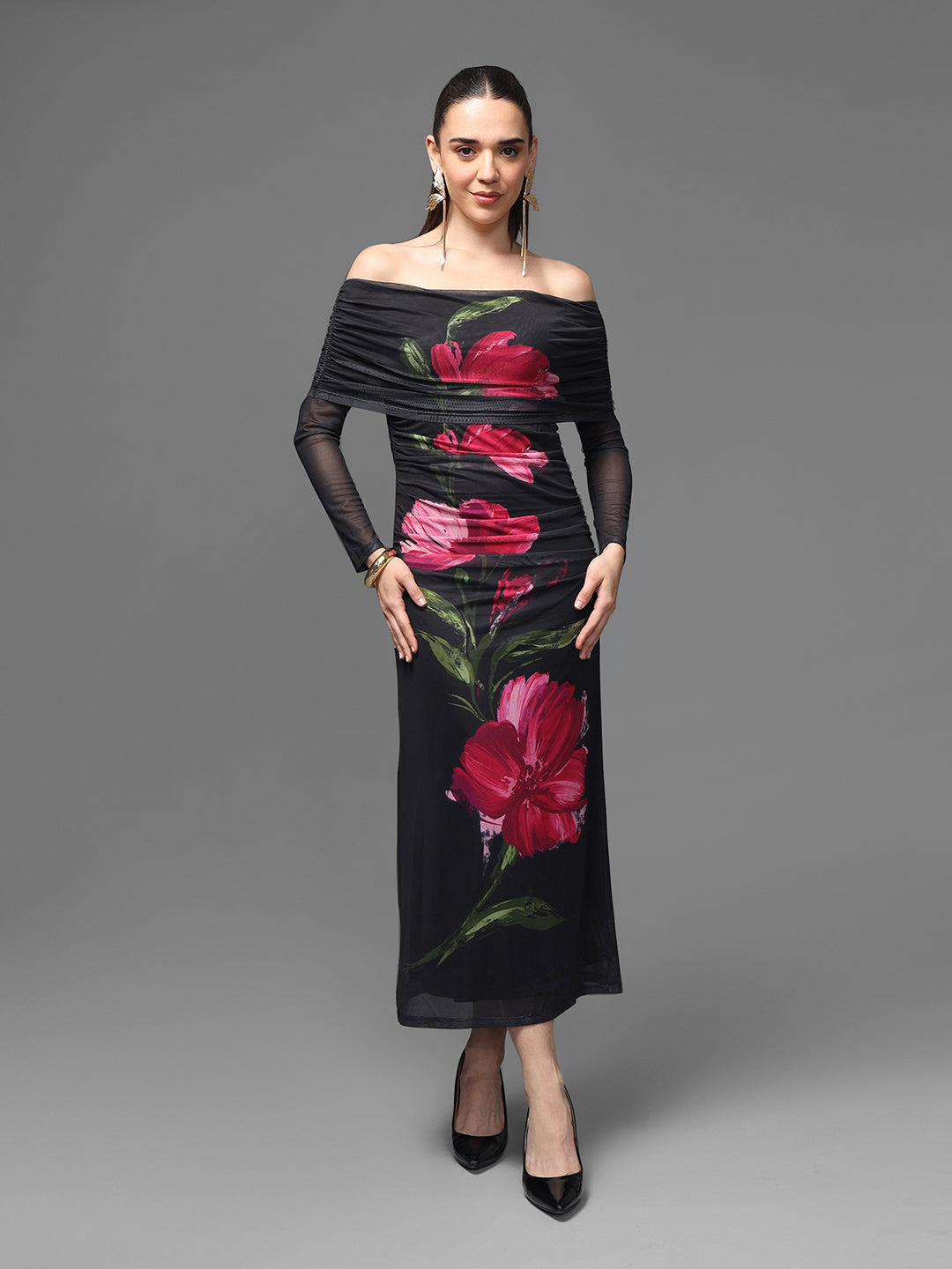The Cairo Maxi Dress Is A Dramatic, Statement-Making Piece Featuring Bold Oversized Floral Artwork Placed Strategically Along The Silhouette. Designed With An Elegant Off-Shoulder Neckline And A Sleek, Body-Skimming Fit, It Beautifully Enhances The Figure While Maintaining Sophistication. Perfect For Evening Events, This Dress Blends Contemporary Glamour With Refined Artistry.
