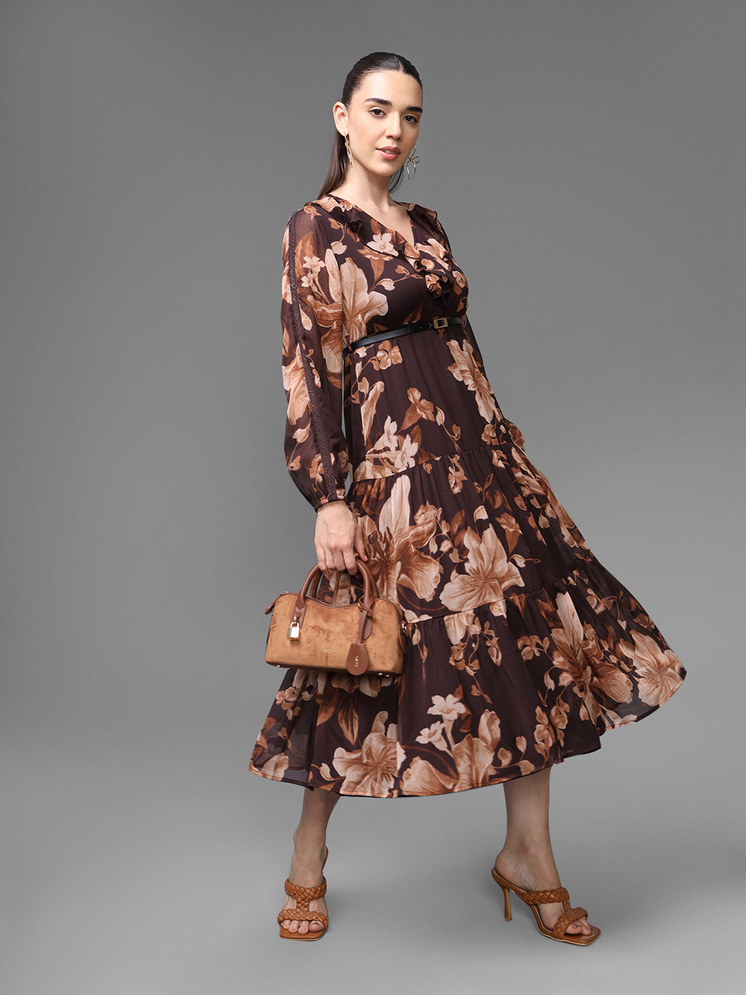 The Floret Maxi Dress with Belt radiates romantic charm and feminine grace. Crafted in a flowy chiffon fabric, it showcases floral print over a brown base— a captivating mix of bold and elegant. The design features a V-neckline with delicate ruffle detailing, sheer long elasticated sleeves with lace detail and a self-fabric tie belt that cinches the waist beautifully. Its tiered silhouette adds movement and ease, making it perfect for both day and evening wear.