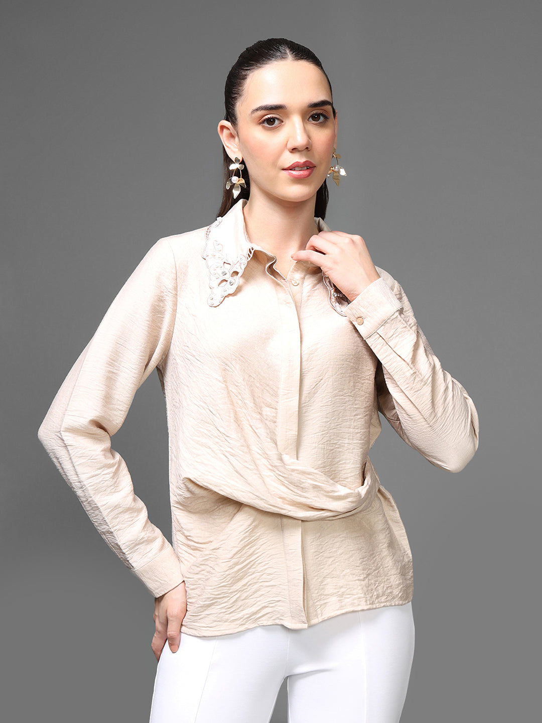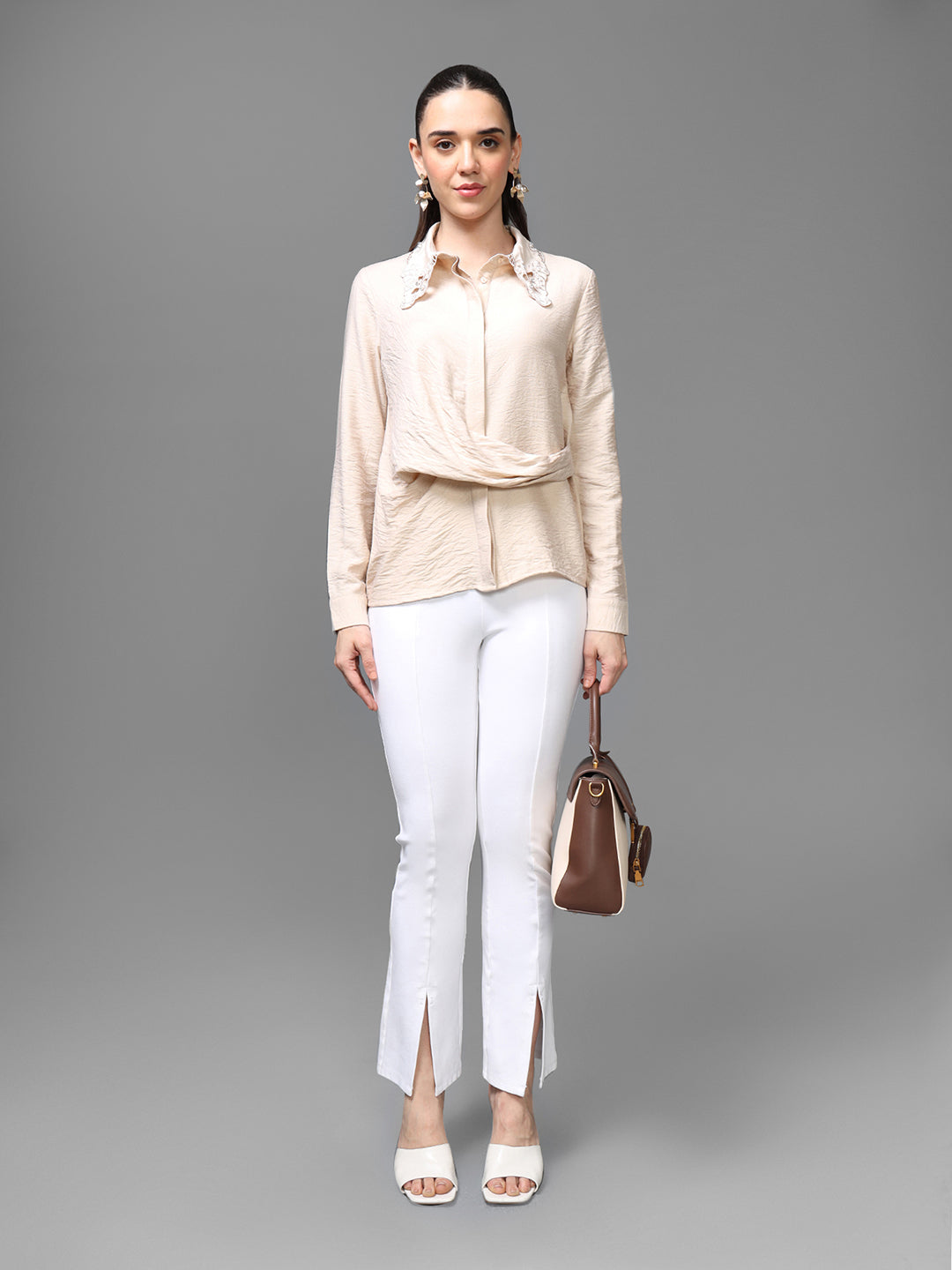 The Gill Shirt is a refined combination of utility and feminine polish. Designed with a relaxed silhouette, it features a soft collared neckline, wrap detail at waist, and embellished collar. The lightweight textured fabric enhances comfort while maintaining an elevated, structured look—perfect for transitioning seamlessly from work to weekend styling.