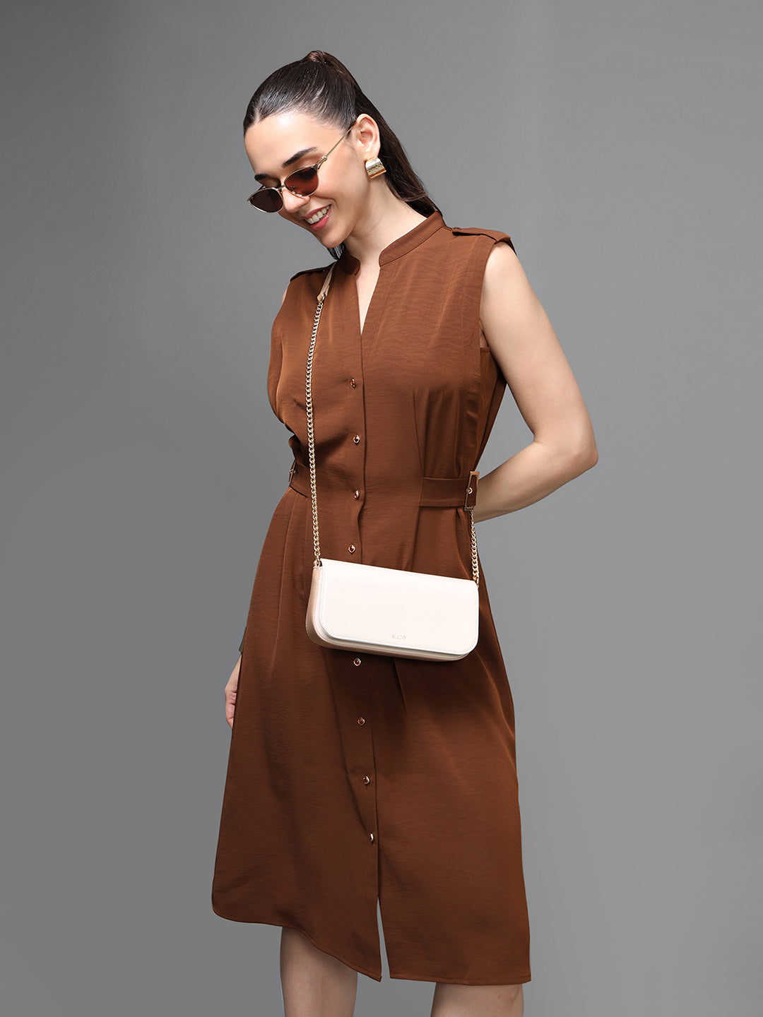 The Chelsea Midi Dress is a timeless, tailored piece designed for effortless sophistication. Its clean sleeveless silhouette and structured bodice create a flattering shape, while the full button-down front adds a touch of classic charm. The tie-up waist cinches the figure beautifully, offering both comfort and definition. Crafted in a refined solid tone, this dress transitions seamlessly from daytime polish to evening elegance, making it a versatile essential for modern wardrobes.