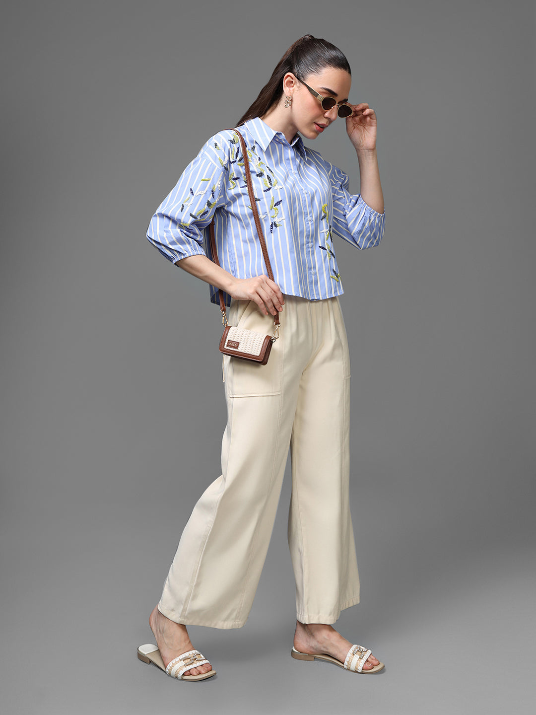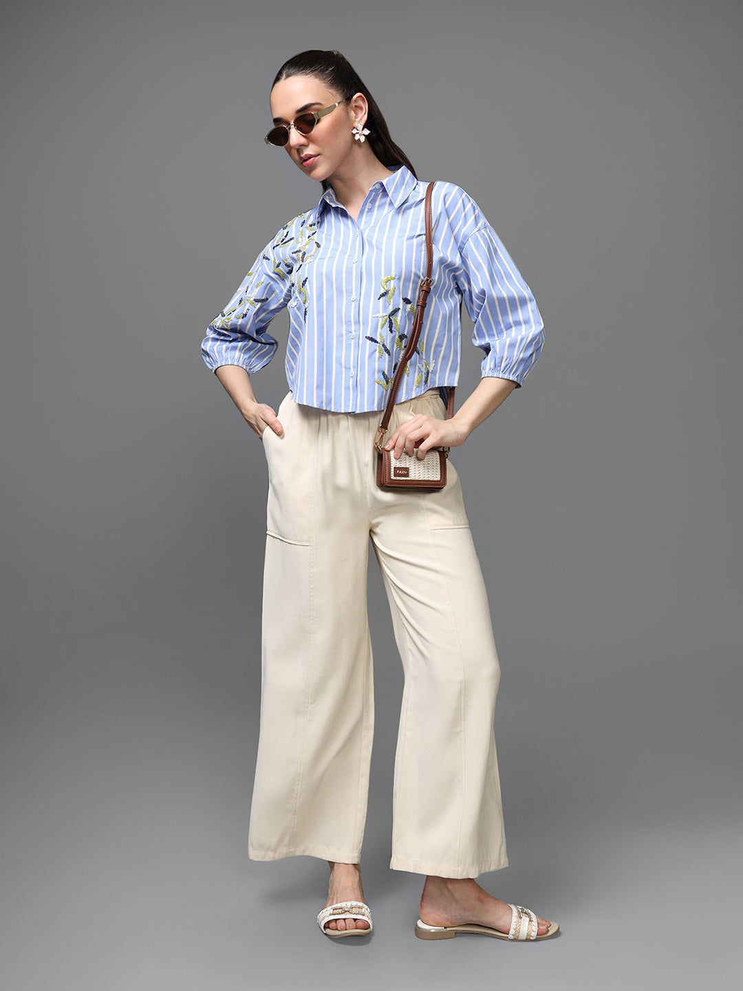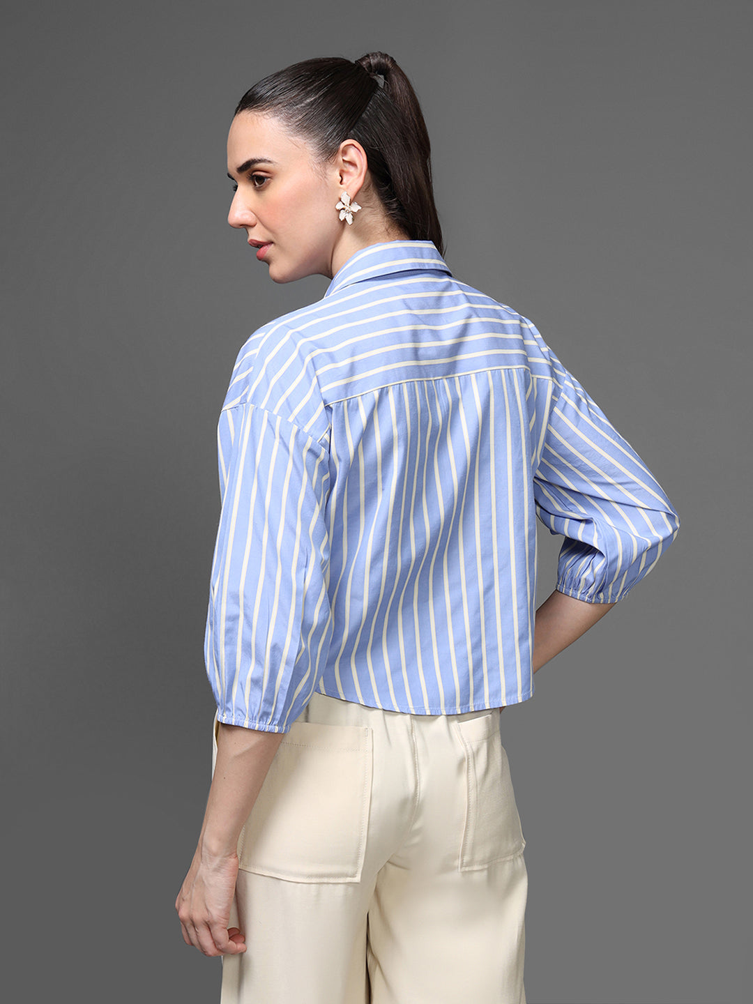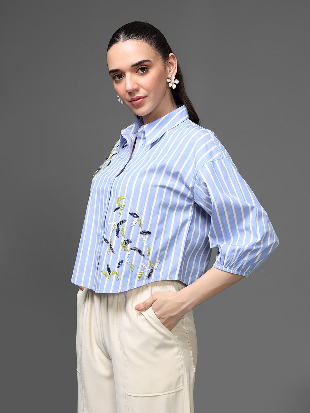 The Manila Shirt is a crisp, modern take on a classic striped button-down. Designed with soft blue-and-white vertical stripes, the shirt features subtle abstract embroidery that adds an elevated, artisanal touch. The relaxed silhouette and 3/4 sleeves make it perfect for effortless everyday dressing with a polished twist.