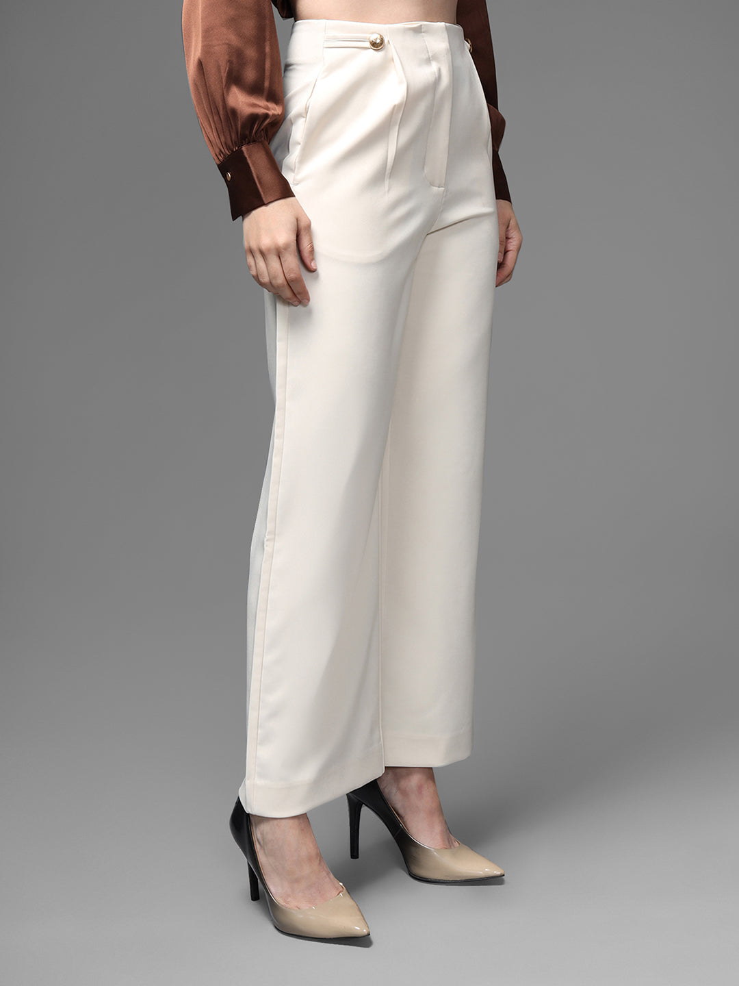 The Bushwick Trousers Are A Refined, Tailored Pair Designed To Deliver A Clean And Structured Silhouette. Crafted In An Elegant Ivory/Cream Tone, These Trousers Feature A Mid-High Rise Waist With Sharp Front Pleats That Elongate The Legs. The Straight-Tapered Fit Adds A Polished Look, While The Subtle Gold-Tone Button Accents At The Waistband Elevate The Design With A Touch Of Luxury. Perfect For Formal Styling, Office Wear, Or Classy Evening Looks.